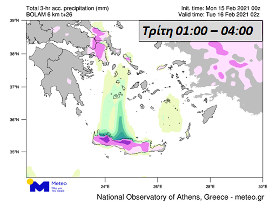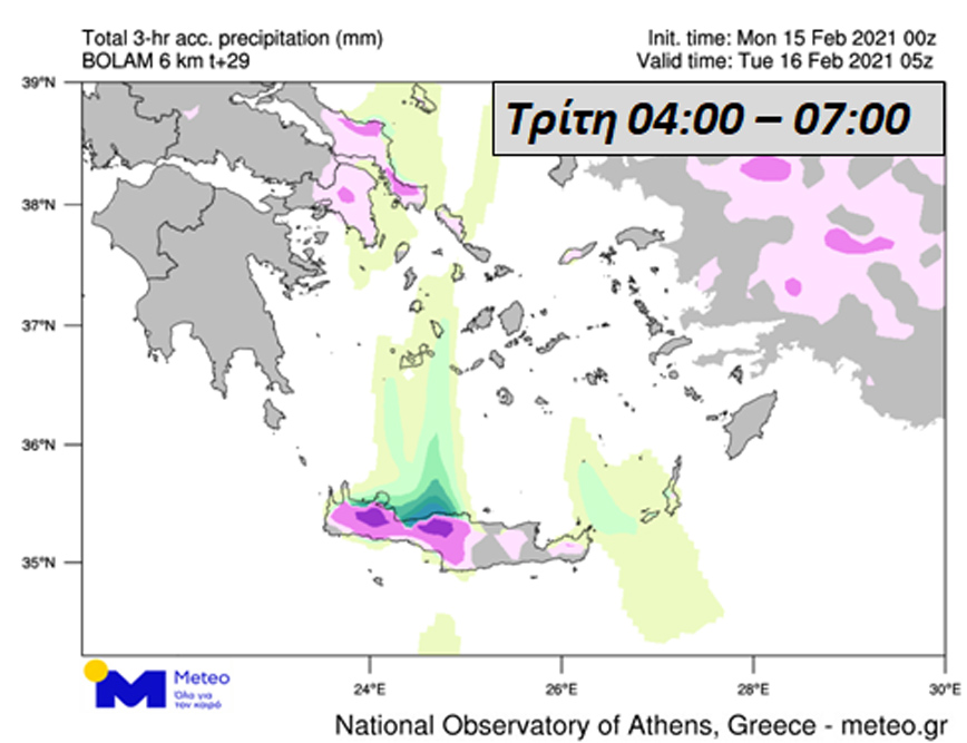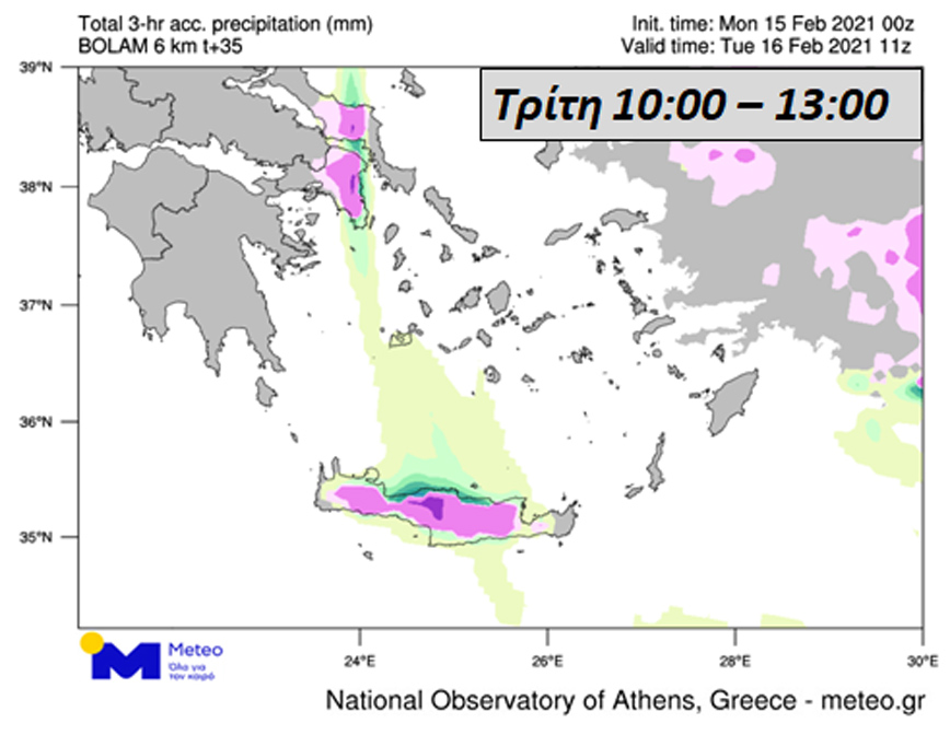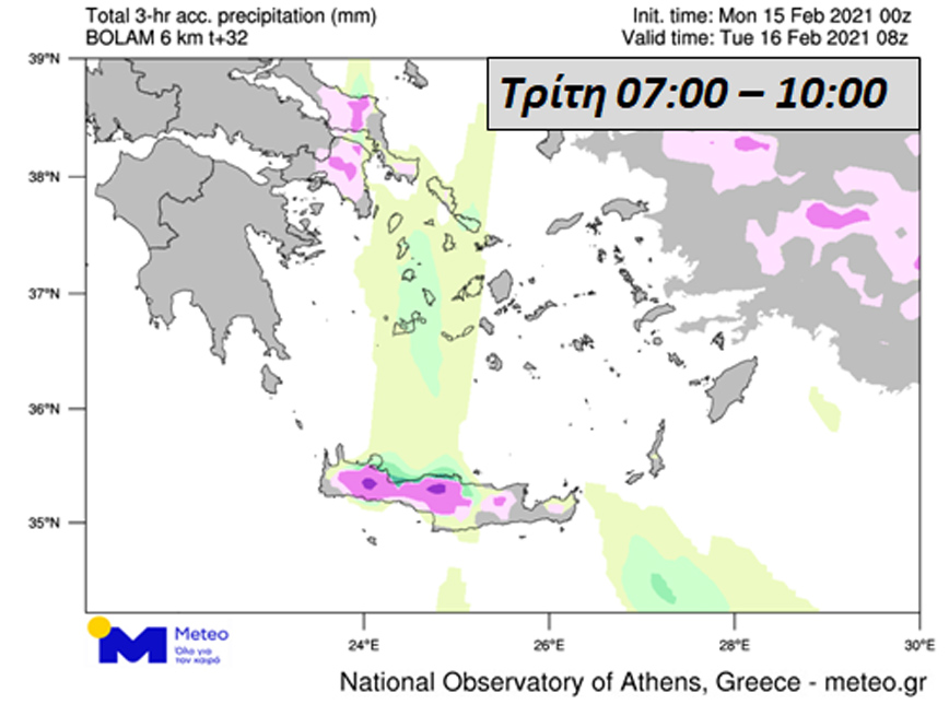 Κατά τη διάρκεια της νύχτας προς την Τετάρτη (17-02-2021) θα περιοριστούν στα βόρεια και ανατολικά και τις πρωινές ώρες της Τετάρτης βαθμιαία θα σταματήσουν.