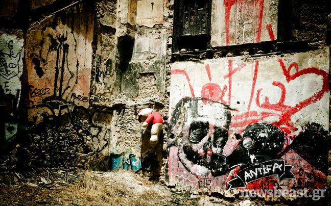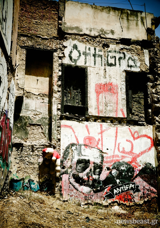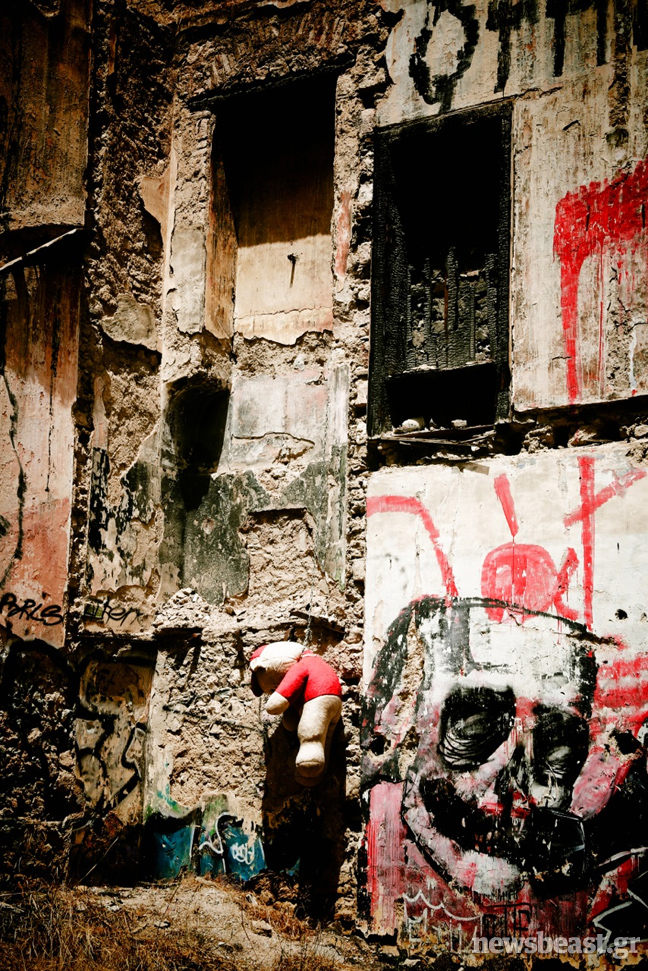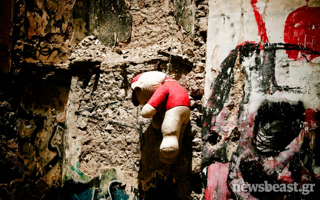 Ίσως το πιο περίεργο έργο αστικής τέχνης που στέκεται τον τελευταίο καιρό στα Εξάρχεια είναι αυτό το κρεμασμένο από το λαιμό, λούτρινο παιδικό αρκουδάκι.