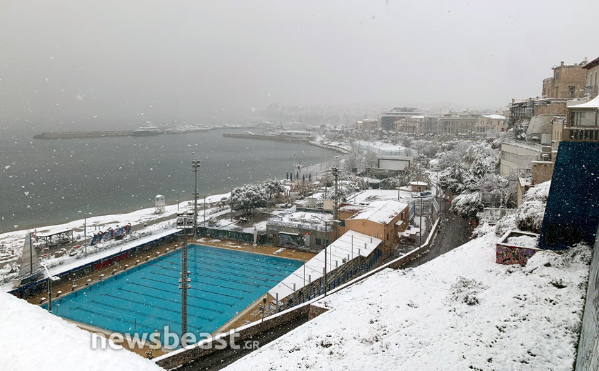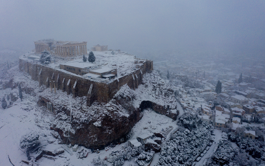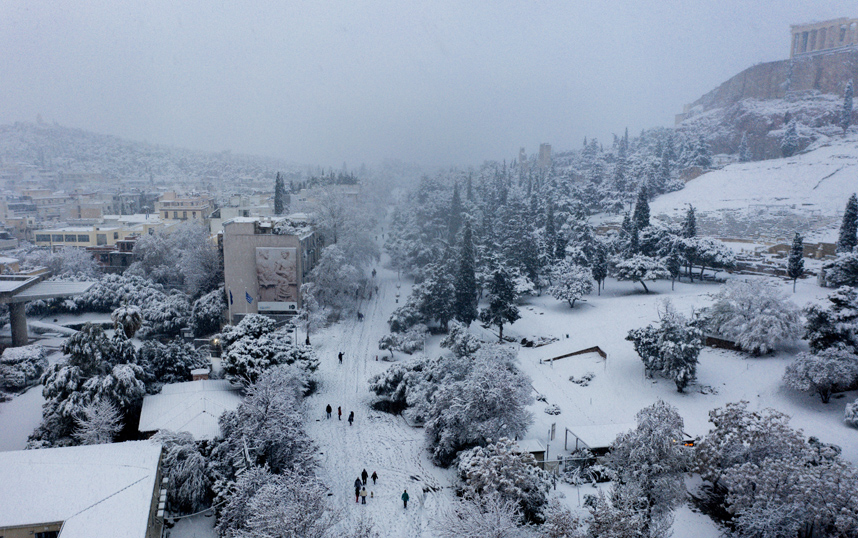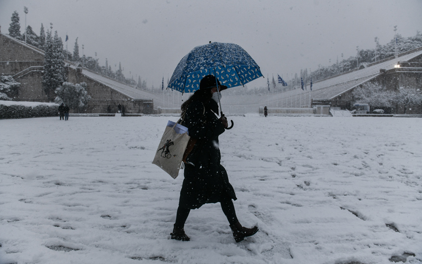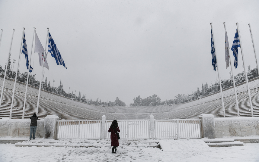 Ακόμα και το Καλλιμάρμαρο Στάδιο θάφτηκε κάτω από ένα άσπρο πέπλο, δίνοντας στους φωτογράφους την ευκαιρία για μοναδικά κλικ.