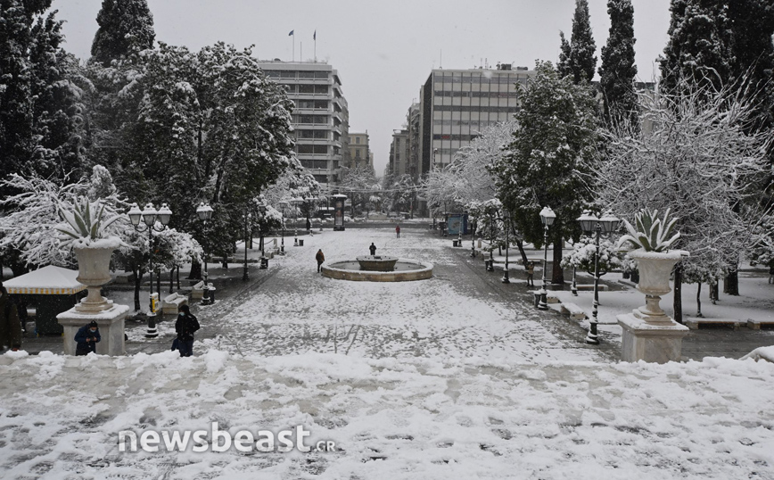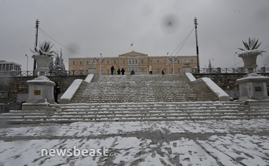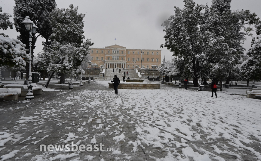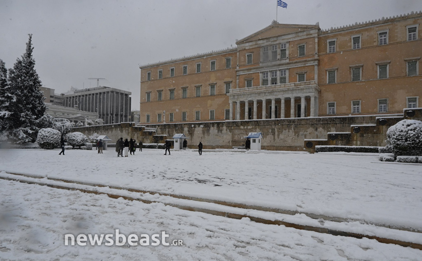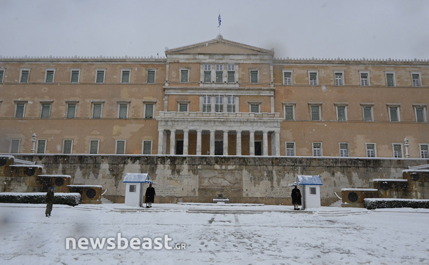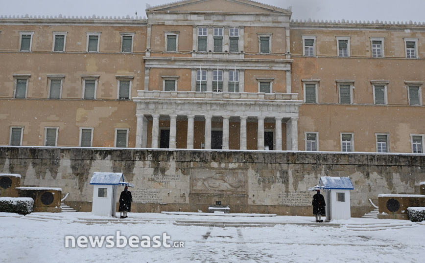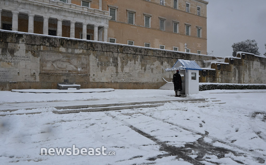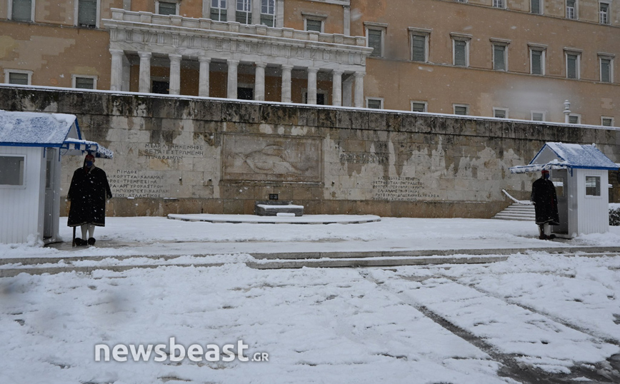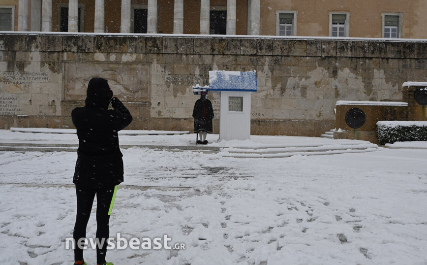 Ακίνητοι, οι εύζωνες παρακολουθούν την ιδιαίτερη σημερινή εικόνα του κέντρου της Αθήνας, που καλύφθηκε με χιόνι. Οι δρόμοι άδειοι και ελάχιστοι τολμηροί βρέθηκαν έξω στον χιονιά, που έχει καλύψει τα πάντα.