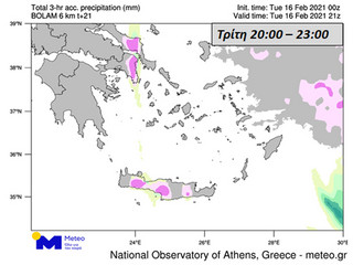 Στους προγνωστικούς χάρτες που ακολουθούν παρουσιάζεται ο ολικός υετός (βροχή/χιόνι) που αναμένεται από το απόγευμα της Τρίτης 16/2 έως τις πρώτες ώρες της Τετάρτης 17/2 σύμφωνα με το μοντέλο πρόγνωσης υψηλής ανάλυσης του Εθνικού Αστεροσκοπείου Αθηνών/meteo.gr. Οι μπλε αποχρώσεις υποδεικνύουν την εκδήλωση βροχής/χιονόνερου και με μωβ αποχρώσεις παρουσιάζεται η ένταση των χιονοπτώσεων.