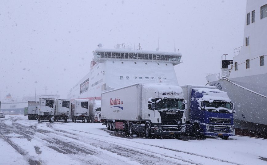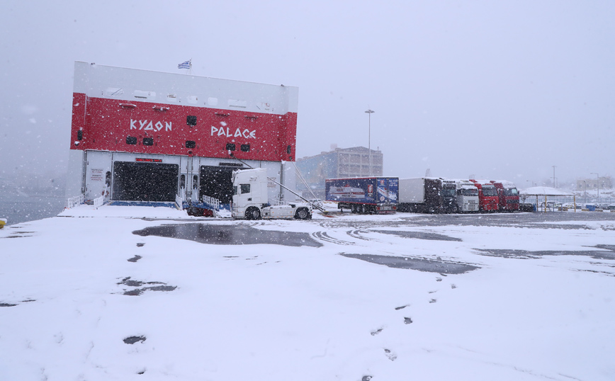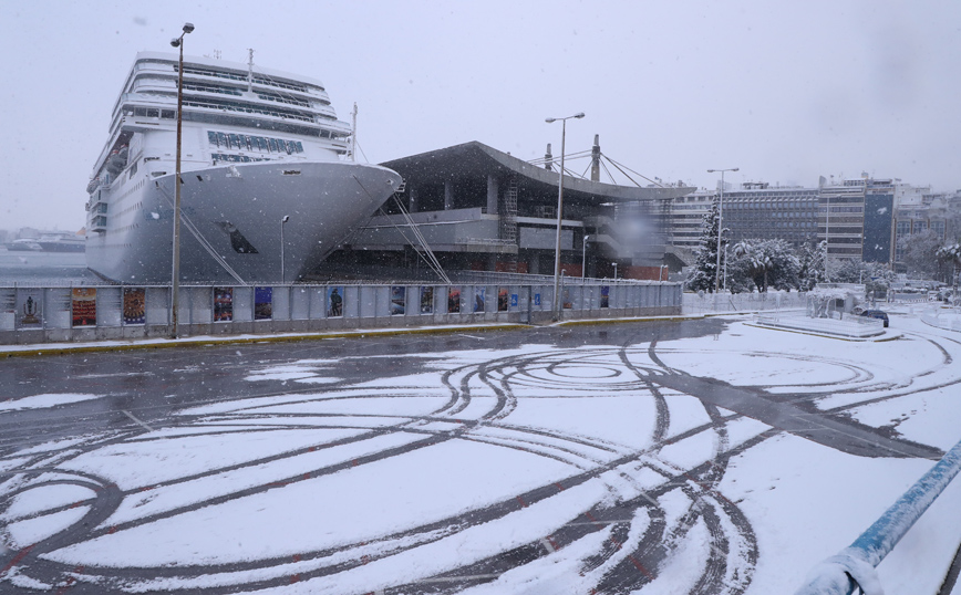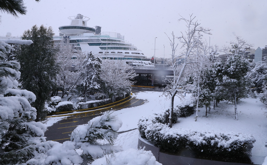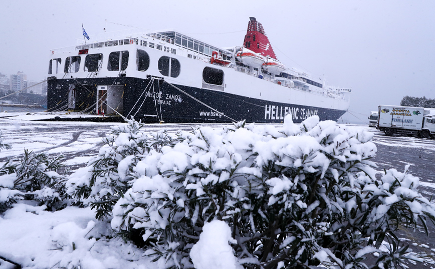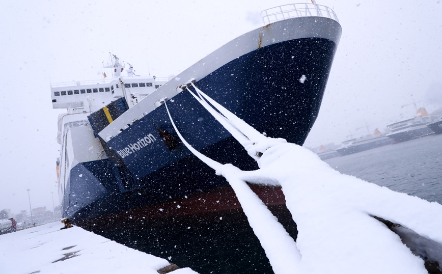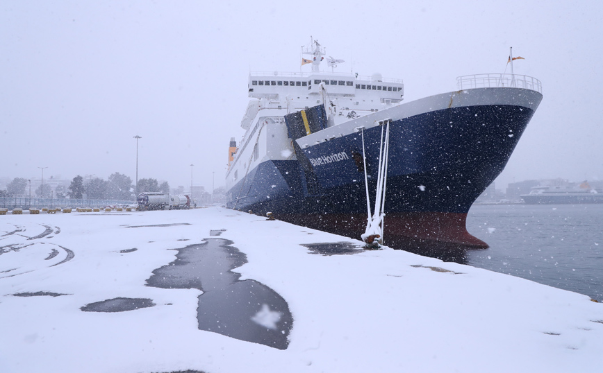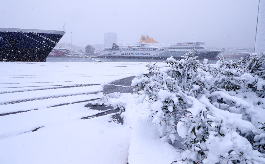 Τα χιόνια, που έφερε η κακοκαιρία Μήδεια, έφτασαν ακόμα και μέσα στο λιμάνι, καλύπτοντας τα αγκυροβολημένα πλοία.