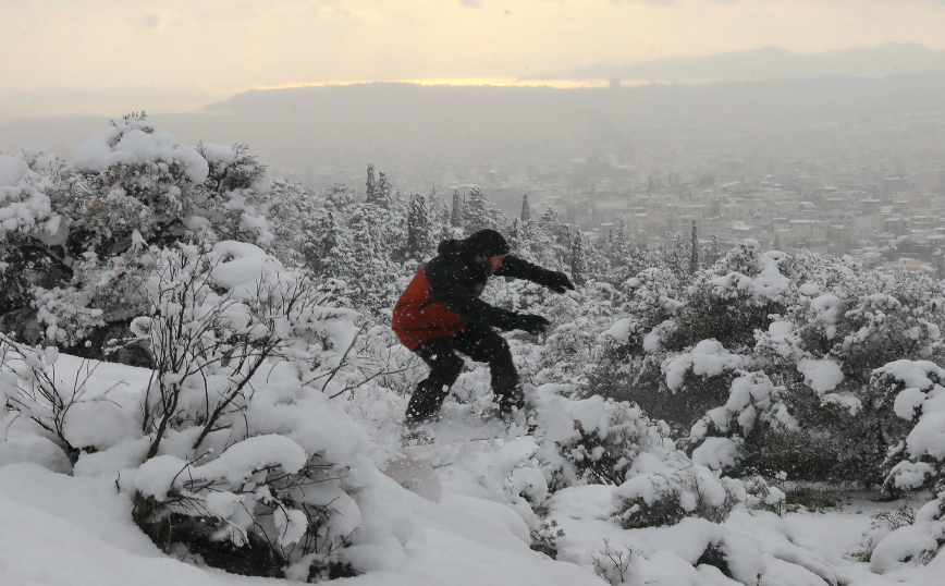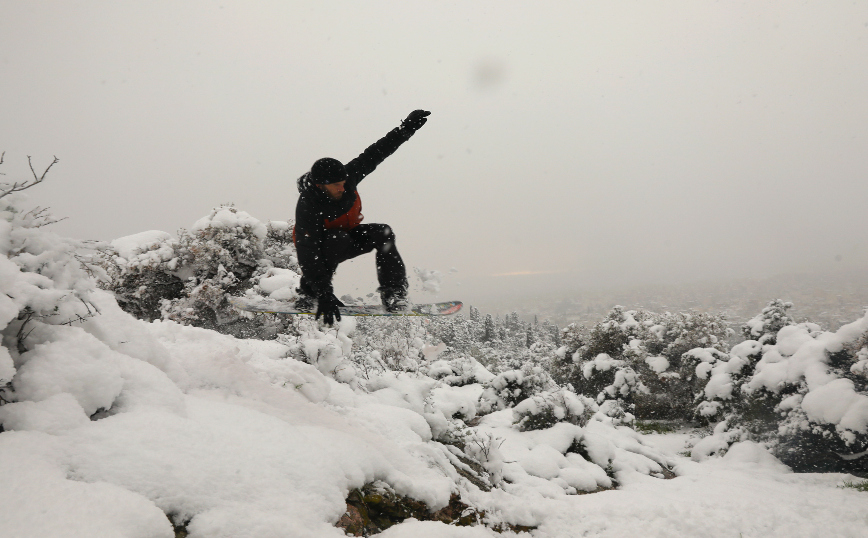 Ο λόφος του Φιλοπάππου σκεπασμένος με χιόνι θύμιζε κάτι μεταξύ ορεινού θερέτρου και… χιονοδρομικού κέντρου με κάτοικο της περιοχής να απολαμβάνει το snowboard στις πλαγιές του.