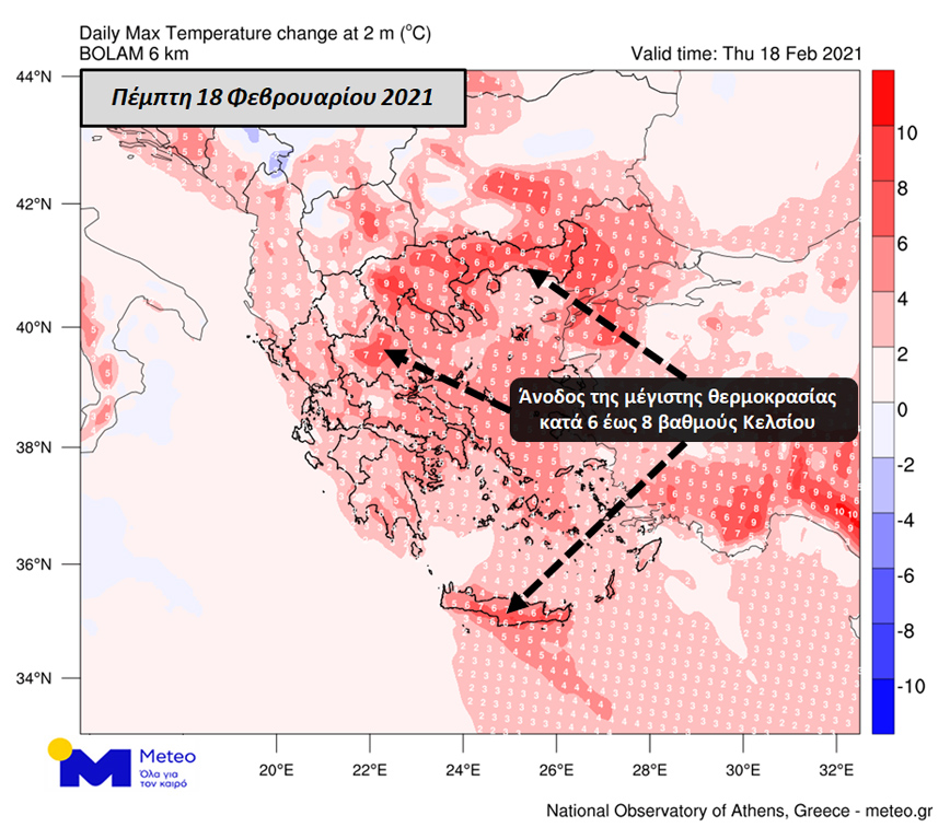 Όπως προκύπτει από τον χάρτη που ακολουθεί και παρουσιάζει την αύξηση της μέγιστης θερμοκρασίας την Πέμπτη 18/2 σε σχέση με την Τετάρτη 17/2, η άνοδος σε Μακεδονία, Θράκη, Θεσσαλία και Κρήτη αναμένεται να φτάσει κατά τόπους τους 6 έως 8 βαθμούς. Περαιτέρω άνοδος της θερμοκρασίας αναμένεται το Σαββατοκύριακο 20-21/2.