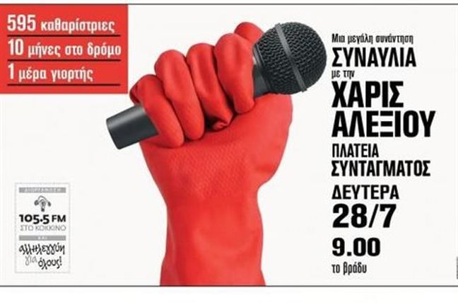 Σήμερα το βράδυ, στις 9, θα πραγματοποιηθεί η συναυλία συμπαράστασης της Χαρούλας Αλεξίου για τις απολυμένες καθαρίστριες του υπουργείου Οικονομικών. Η συναυλία θα γίνει στην πλατεία Συντάγματος.