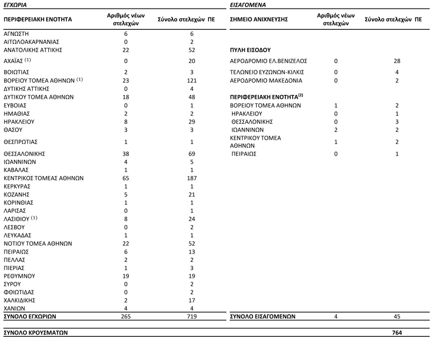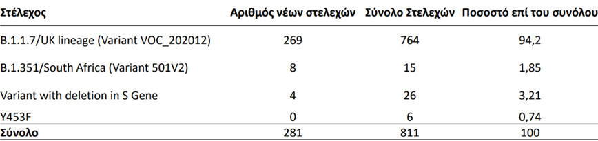 Συνολικά έχουν ταυτοποιηθεί 764 θετικά για την παρουσία μετάλλαξης Β.1.1.7/UKlineage (Variant VOC_202012) και 15 θετικά για την παρουσία μετάλλαξης B.1.351/South Africa (Variant 501V2) από την έναρξη λειτουργίας του Εθνικού Δικτύου Γονιδιωματικής Επιτήρησης για τις μεταλλάξεις του SARS-CoV-2 έως σήμερα.