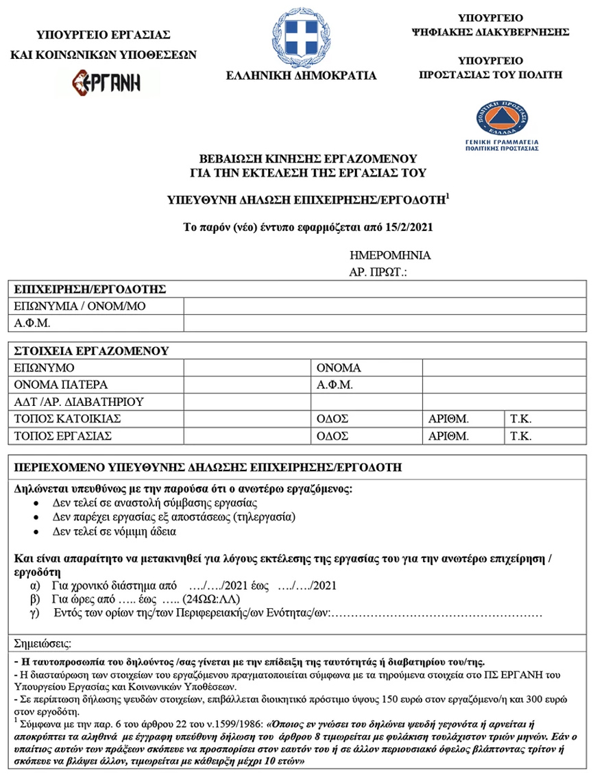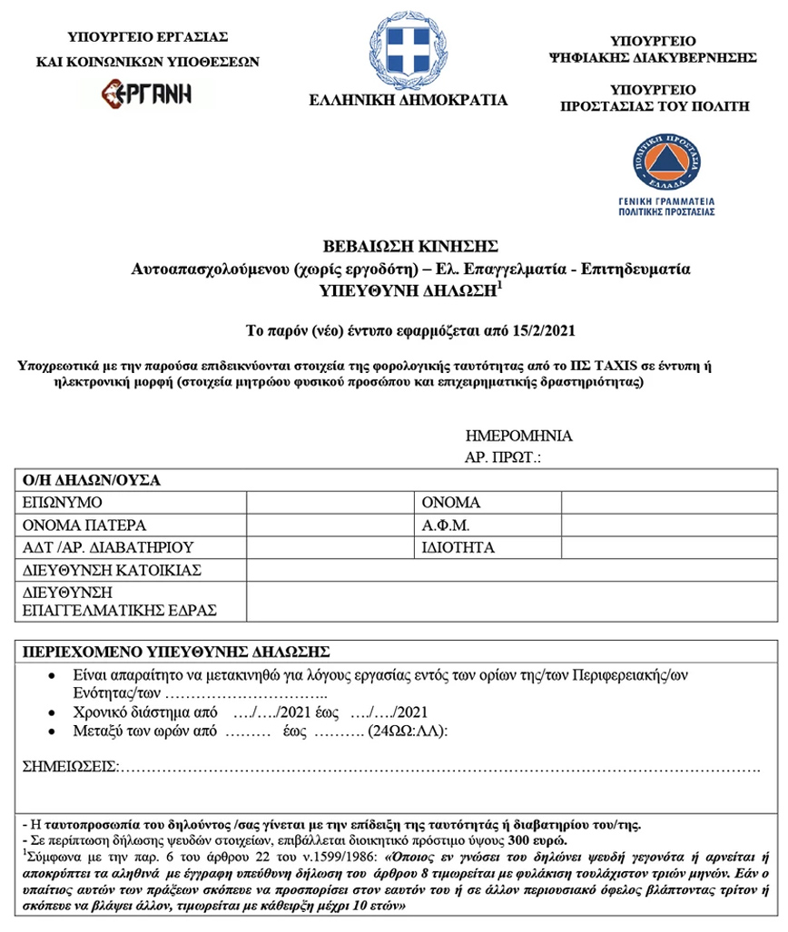 Με το νέο έντυπο μέσω του ΠΣ ΕΡΓΑΝΗ ή από τον ιστότοπο https://forma.gov.gr μπορούν επίσης να μετακινούνται οι αυτοαπασχολούμενοι χωρίς εργοδότη, οι ελεύθεροι επαγγελματίες και οι επιτηδευματίες.