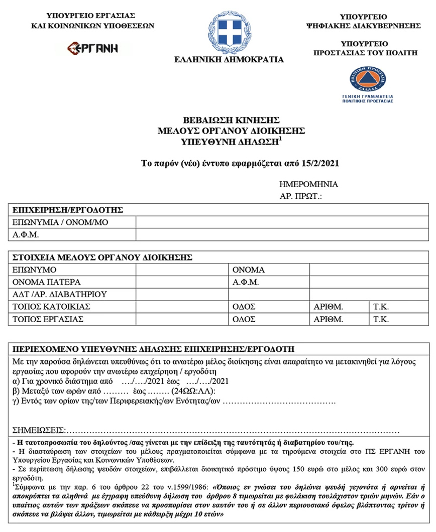 Τέλος, με νέο έντυπο μέσω του ΠΣ ΕΡΓΑΝΗ θα μπορούν επίσης να μετακινούνται τα μέλη οργάνου διοίκησης, κατόπιν υπεύθυνης δήλωσης της επιχείρησης που μετέχουν.
