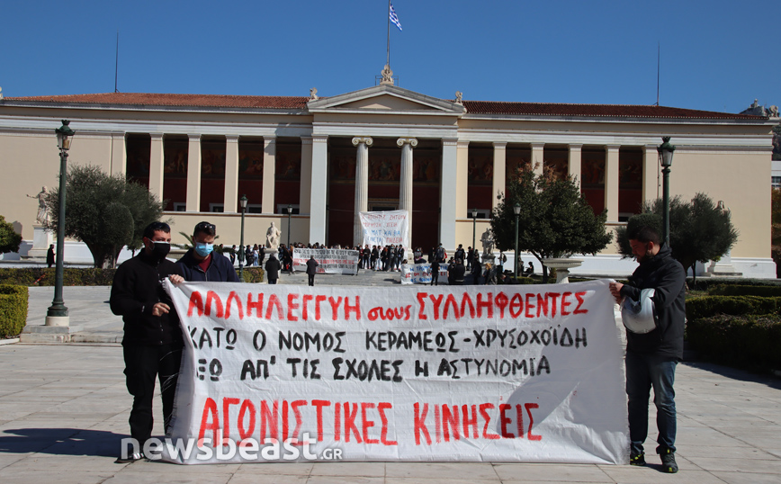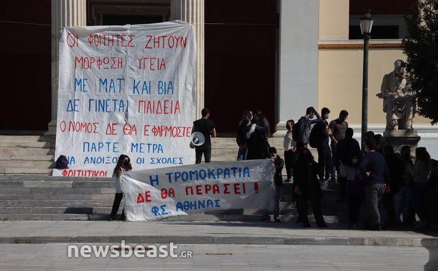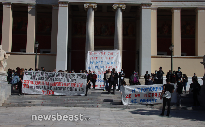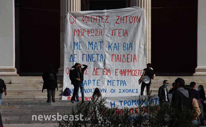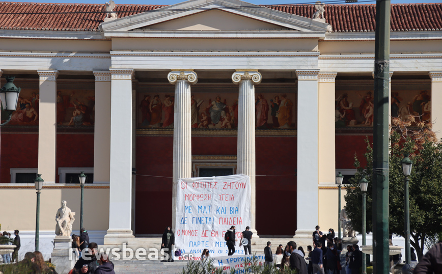 Οι διαδηλωτές συγκεντρώθηκαν στα Προπύλαια και ύψωσαν πανό εκδηλώνοντας την υποστήριξή τους στους φοιτητές.
