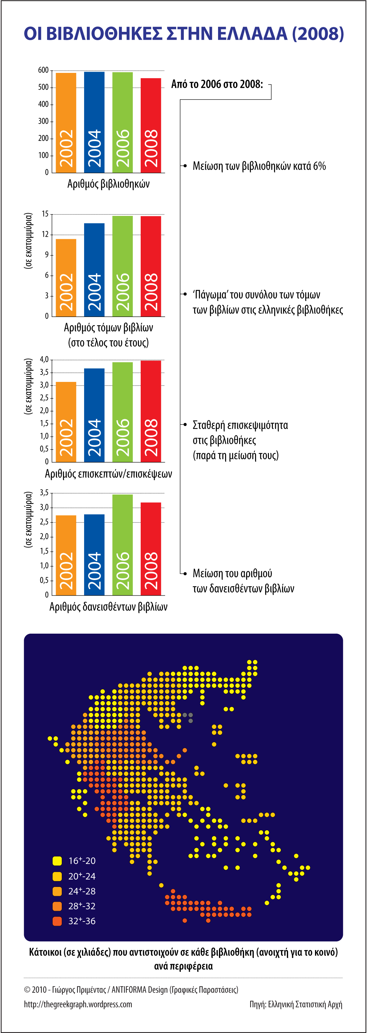 Σύμφωνα με τα στοιχεία, συνολικά στην Ελλάδα από τις 556 βιβλιοοθήκες για το 2008, οι 499 ήταν ανοιχτές στο κοινό. Κατά μέσο όρο, 22,5 χιλιάδες κάτοικοι αντιστοιχούν σε κάθε μία βιβλιοθήκη. Στην Ιρλανδία το 2008 η αναλογία ήταν 12 χιλιάδες κάτοικοι ανά βιβλιοθήκη.