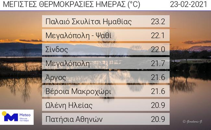 Σύμφωνα με το δίκτυο των αυτόματων μετεωρολογικών σταθμών του Αστεροσκοπείου, η μεγαλύτερη θερμοκρασία καταγράφηκε στο Παλαιό Σκυλίτσι Ημαθίας με 23,2 βαθμούς Κελσίου. Ακολούθησαν Μεγαλόπολη-Ψαθί (22,1), Σίνδος (22), Μεγαλόπολη (21,7), Άργος (21,7) και Βέροια-Μακροχώρι (21,6 βαθμοί).