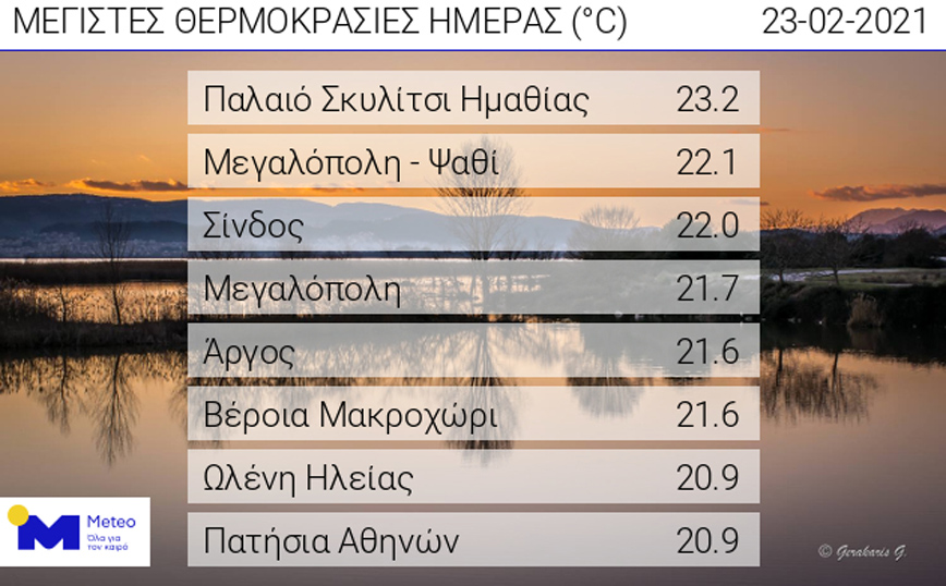 Συγκεκριμένα το θερμόμετρο έδειξε 23,2 βαθμούς στο Παλαιό Σκυλίτσι Ημαθίας και 22,1 στη Μεγαλόπολη – Ψαθί.