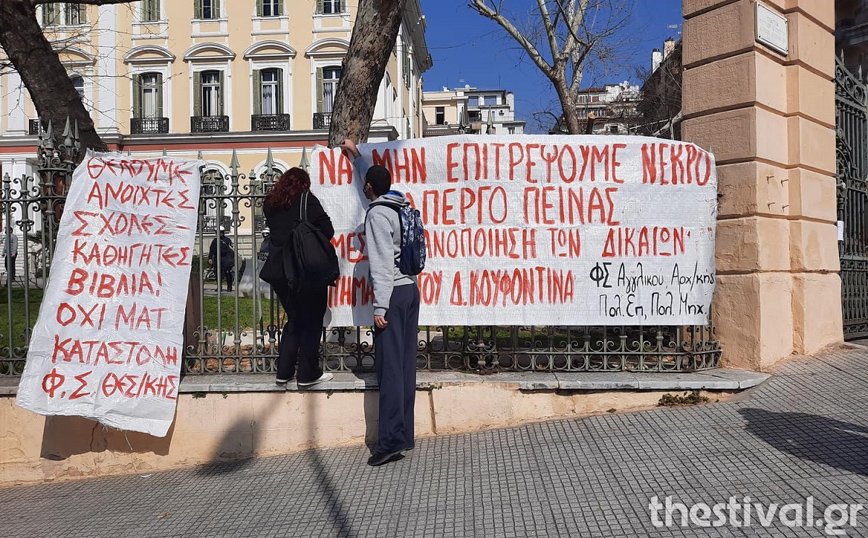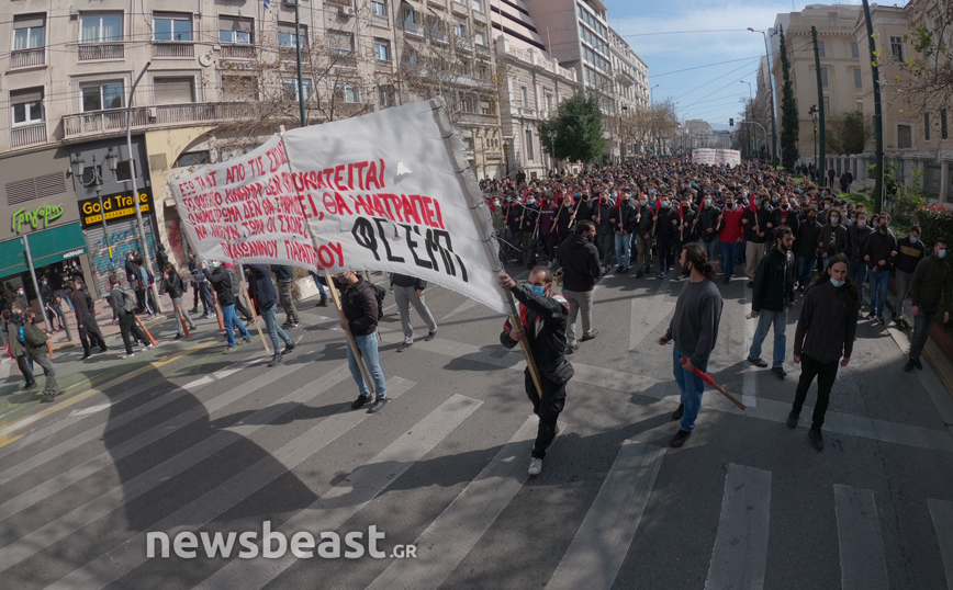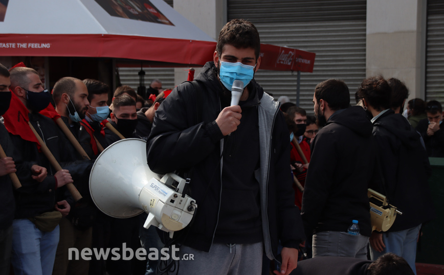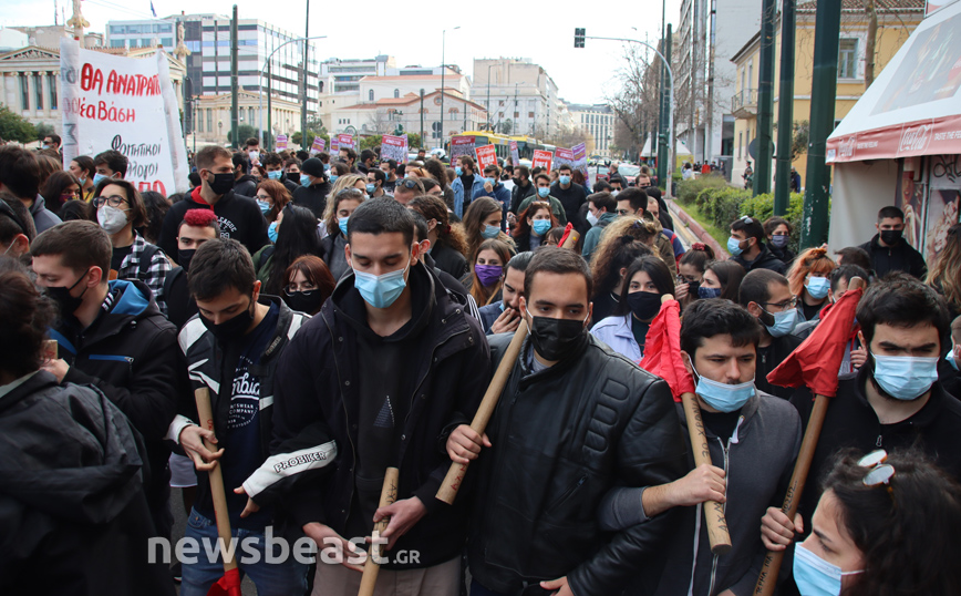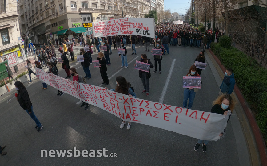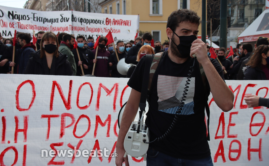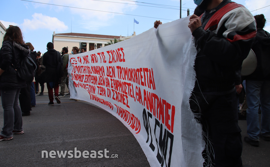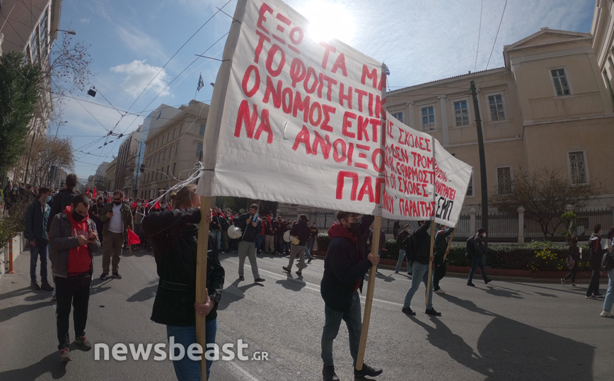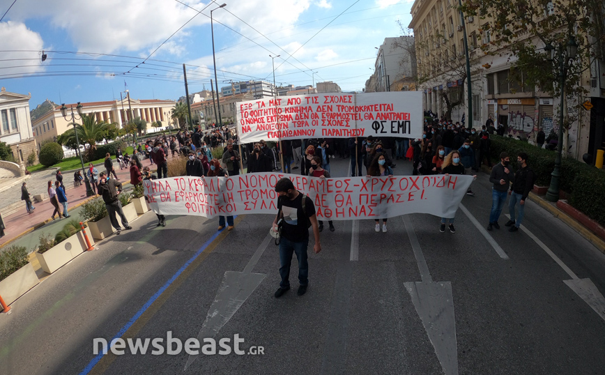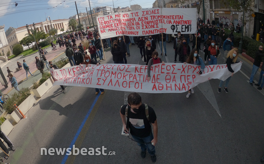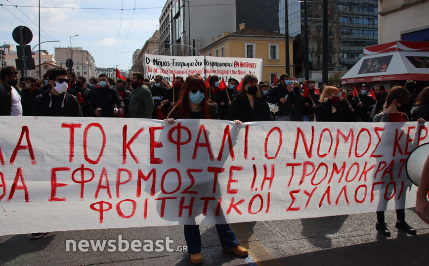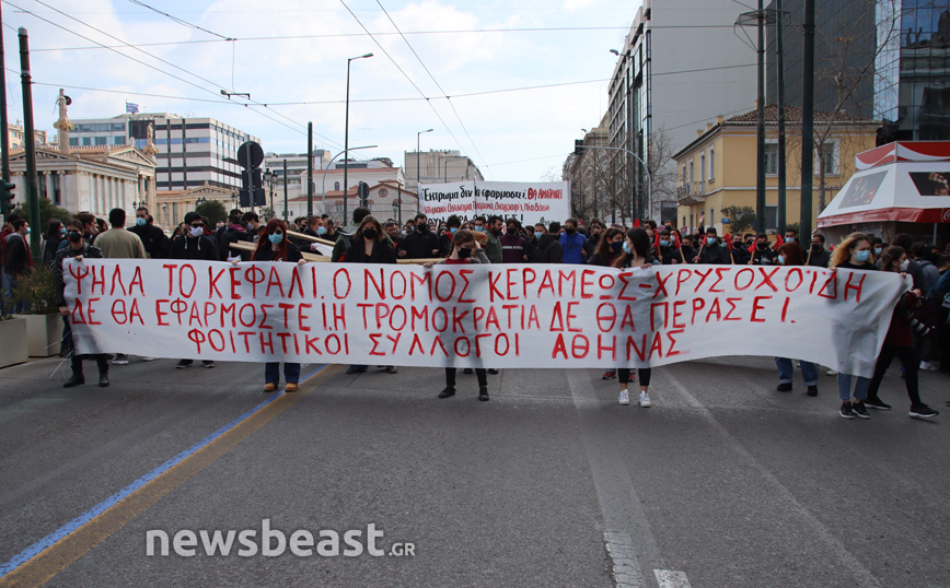 «Ψηλά το κεφάλι, ο νόμος Κεραμέως – Χρυσοχοΐδη δε θα εφαρμοστεί, η τρομοκρατία δε θα περάσει. Φοιτητικοί Σύλλογοι Αθηνών», αναγράφεται σε ένα μεγάλο πανό που κρατούν οι φοιτητές που έχουν συγκεντρωθεί στα Προπύλαια για το πανεκπαιδευτικό συλλαλητήριο.