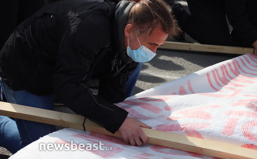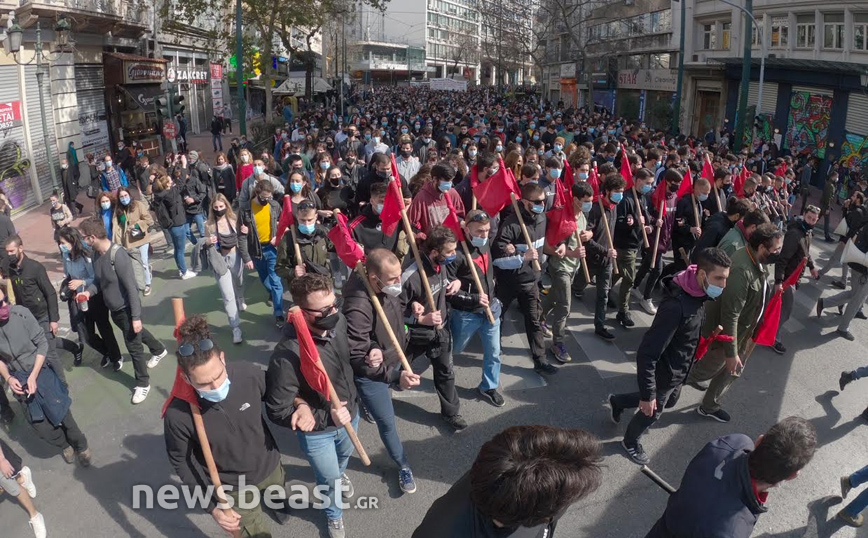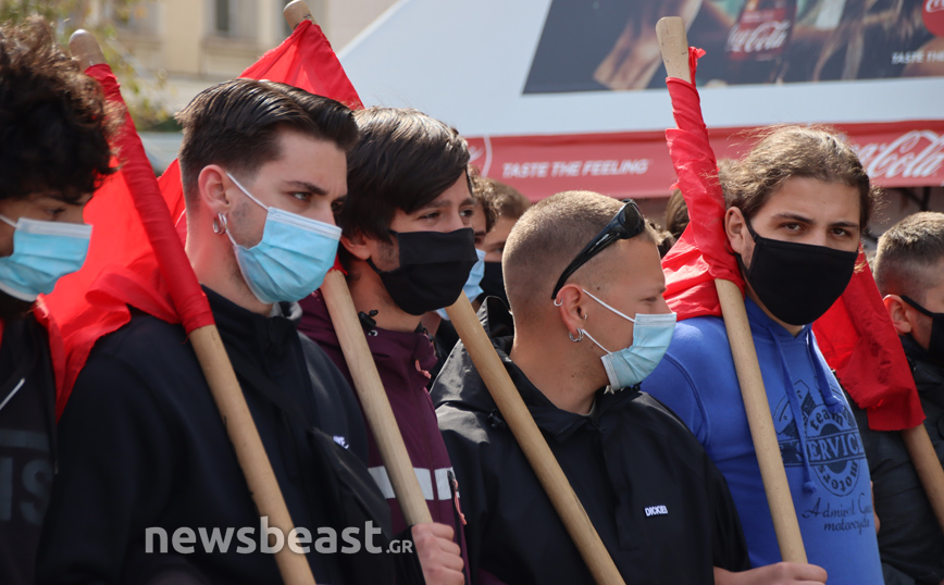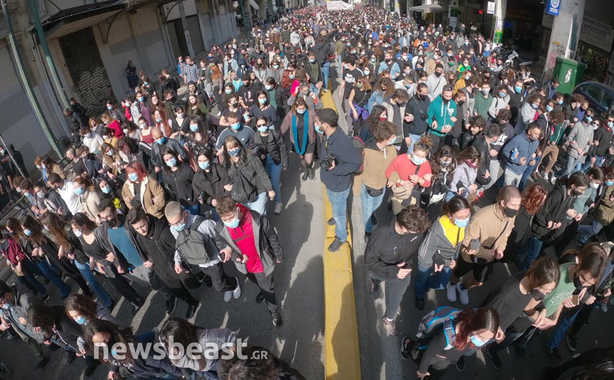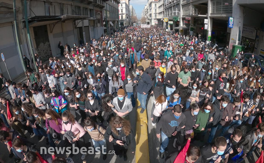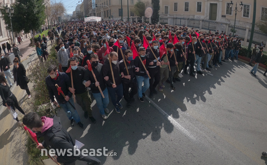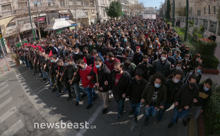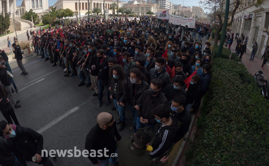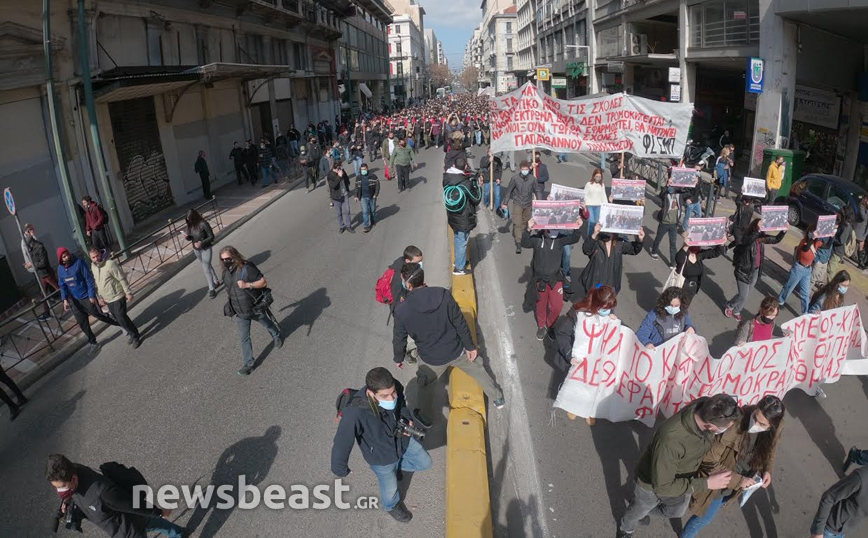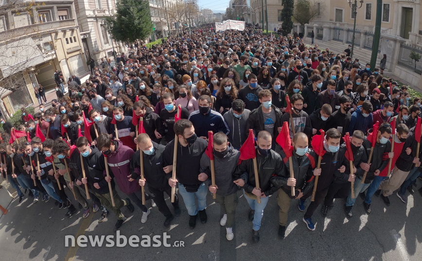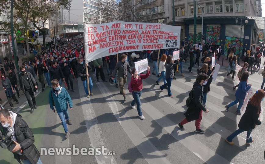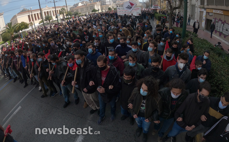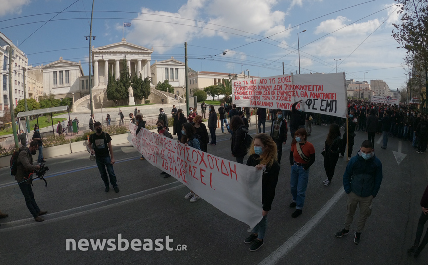 «Ψηλά το κεφάλι, ο νόμος Κεραμέως – Χρυσοχοΐδη δε θα εφαρμοστεί, η τρομοκρατία δε θα περάσει. Φοιτητικοί Σύλλογοι Αθηνών», αναγράφεται σε ένα μεγάλο πανό που κρατούν οι φοιτητές που έχουν συγκεντρωθεί στα Προπύλαια για το πανεκπαιδευτικό συλλαλητήριο.
