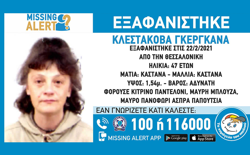 Πρόκειται για την Γκεργκάνα Κλεστάκοβα, την εξαφάνισή της οποίας δήλωσε σήμερα ο σύζυγός της στο τμήμα Ασφαλείας Λευκού Πύργου. Σύμφωνα με όσα ανέφερε εκείνος, τα ίχνη της χάθηκαν από την περιοχή του κέντρου της Θεσσαλονίκης.