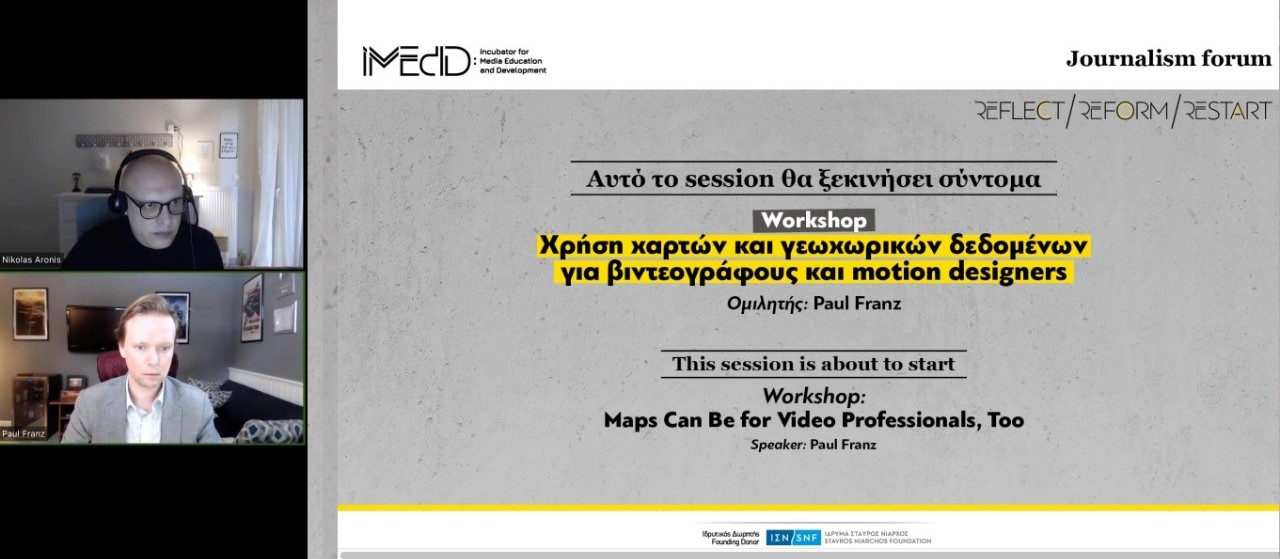 -Workshop «Xρήση χαρτών και γεωχωρικών δεδομένων για βιντεογράφους και motion designers», όπου ο Paul Franz, Chief Innovation Officer SNF, εξήγησε μέσα από παραδείγματα, πώς η χρήση χαρτών, μπορεί να αποτελέσει σημαντικό εργαλείο της δημοσιογραφικής αφήγησης, και πώς σε πολλές περιπτώσεις, ένας χάρτης μπορεί από μόνος του να είναι μια ιστορία.
