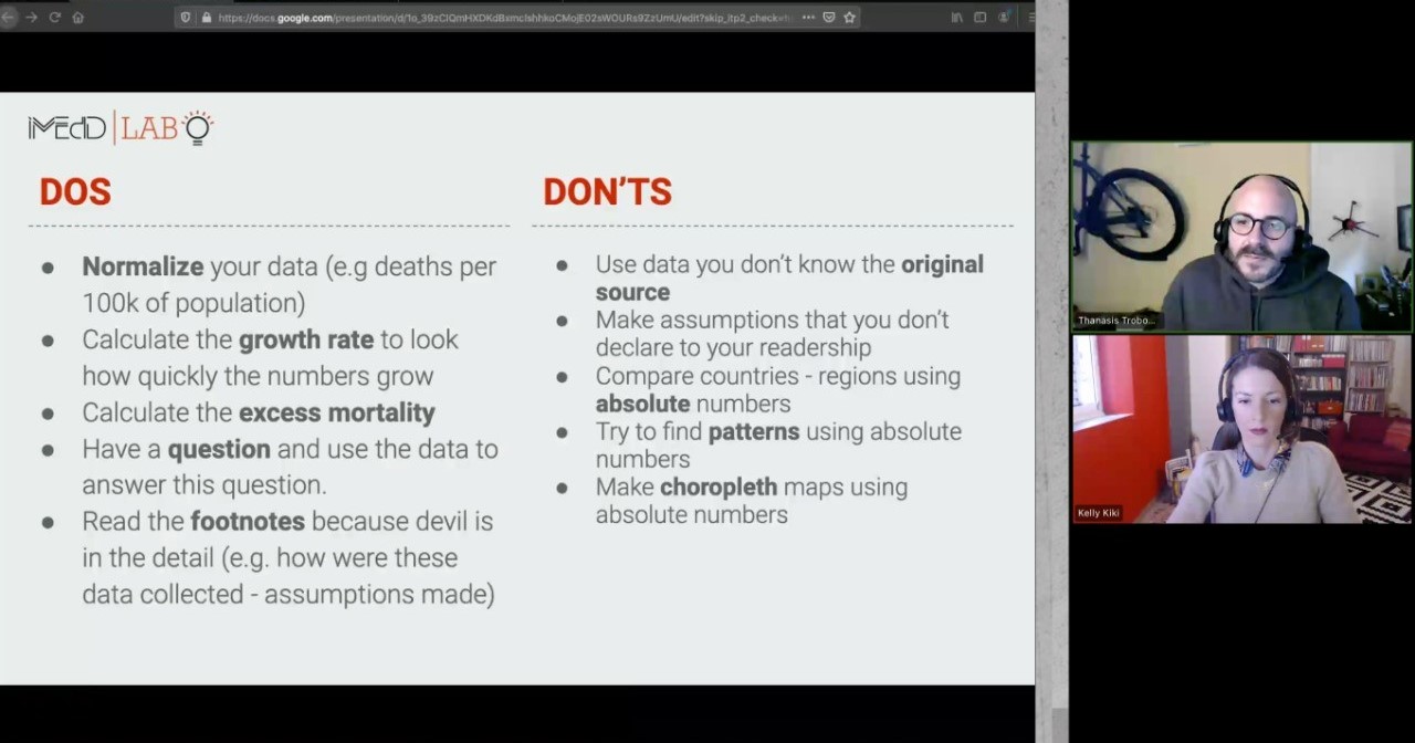 -Flash Session «Dos & Dont’s όταν αναλύουμε δεδομένα για την COVID», όπου οι Κέλλυ Κική και Θανάσης Τρομπούκης, project managers του iMEdD Lab, Δημοσιογράφοι, παρουσίασαν βέλτιστες πρακτικές για την κανονικοποίηση των επιδημιολογικών δεδομένων με βάση τους επιμέρους τοπικούς πληθυσμούς, την υπερέχουσα θνησιμότητα, τον συνυπολογισμό των τεστ κατά την ανάλυση στοιχείων για τα επιβεβαιωμένα κρούσματα και τις διαφορετικές πολιτικές των χωρών ως προς τους ελέγχους που διεξάγουν.