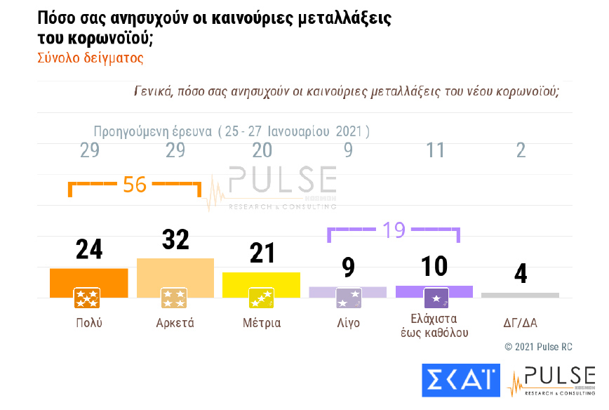 «Πόσο σας ανησυχούν οι καινούριες μεταλλάξεις του κορονοϊού;» ήταν η πρώτη ερώτηση που δέχθηκαν οι πολίτες και το 56% απάντησε πολύ ή αρκετά. Το 21% απάντησε μέτρια ενώ το 19 % ανησυχεί λίγο ή καθόλου.