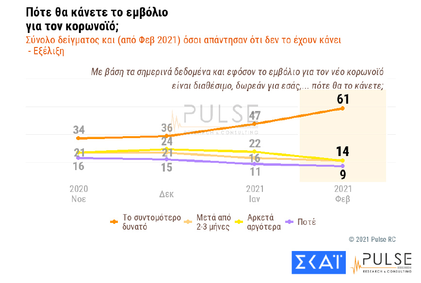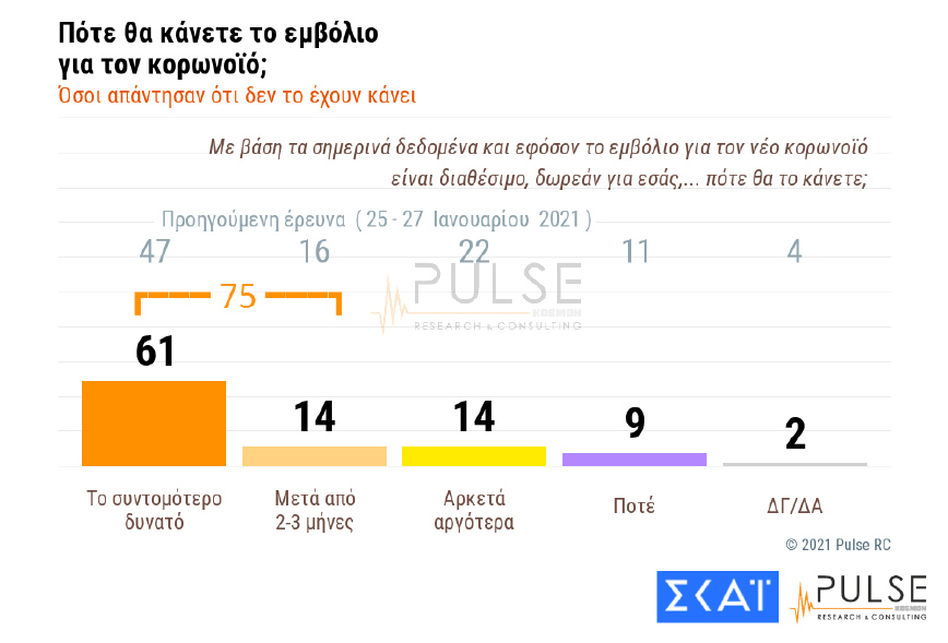 «Πότε θα κάνετε το εμβόλιο του κορονοϊού;». Το 75% απάντησε το συντομότερο δυνατό ή μετά από 2-3 μήνες.