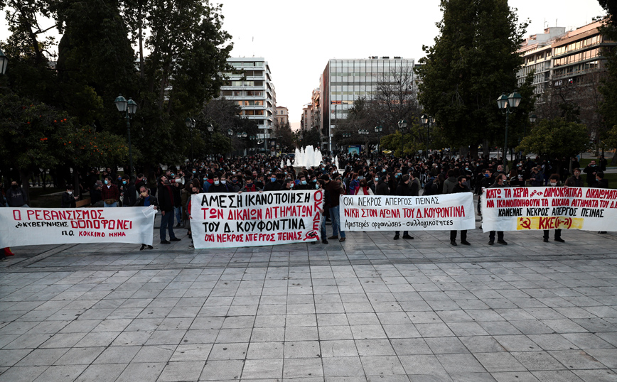 «Την 18.00 ώρα σήμερα (Δευτέρα 1 Μαρτίου 2021), με πρωτοβουλία της “συνέλευσης αλληλεγγύης στον απεργό πείνας Δ. Κουφοντίνα” και διαφόρων οργανώσεων και συλλογικοτήτων, πραγματοποιήθηκε συνάθροιση (2.000) περίπου ατόμων, στο χώρο μπροστά από το Μνημείο του Αγνώστου Στρατιώτη.