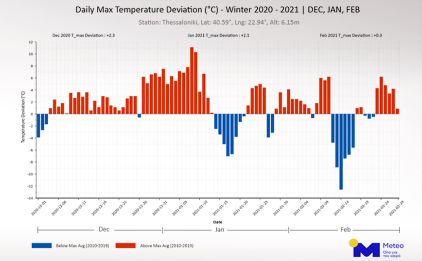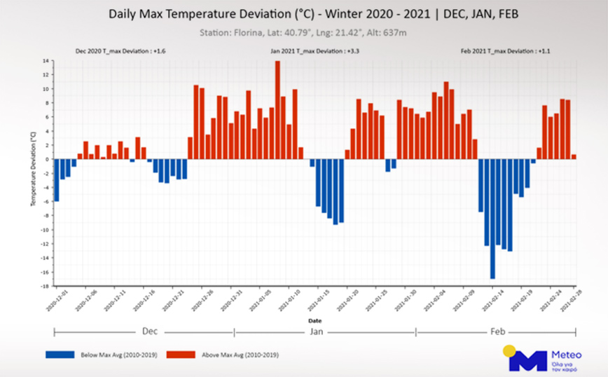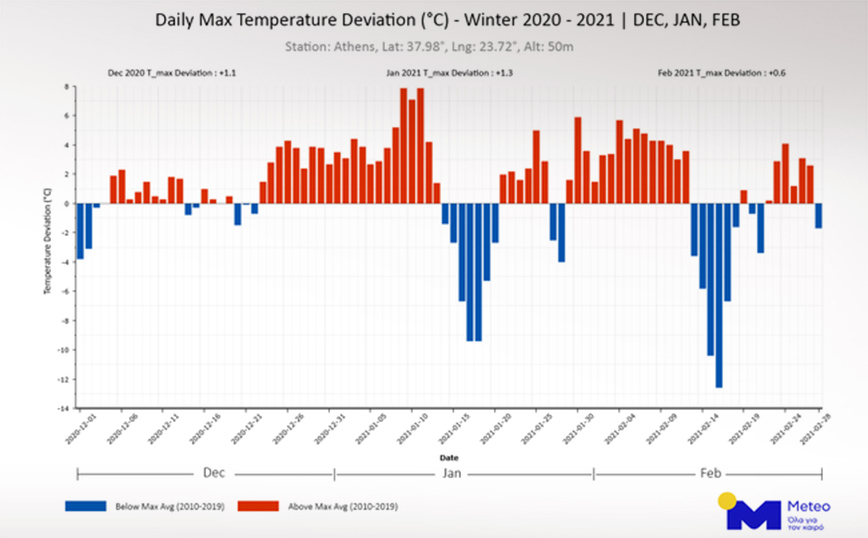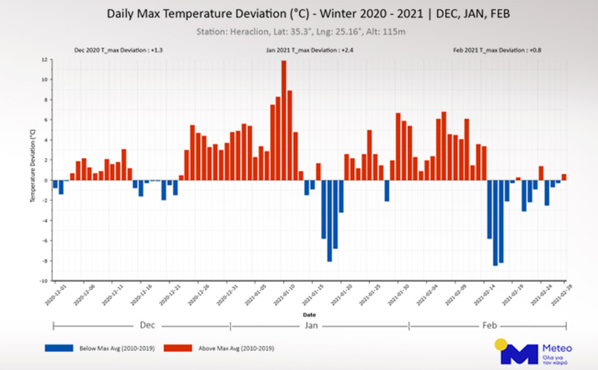 Διακρίνονται ξεκάθαρα οι δύο ισχυρές ψυχρές εισβολές που επηρέασαν τη χώρα μας: ο Λέανδρος (14-18/01/2021) και η Μήδεια (13-17/02/2021). Ο θερμότερος μήνας του χειμώνα ήταν ο Ιανουάριος του 2021, με σημαντική απόκλιση της μέσης μέγιστης θερμοκρασίας από τη μέση τιμή της τελευταίας δεκαετίας, και στους 4 σταθμούς που αναφέρονται στην παρούσα ανακοίνωση.