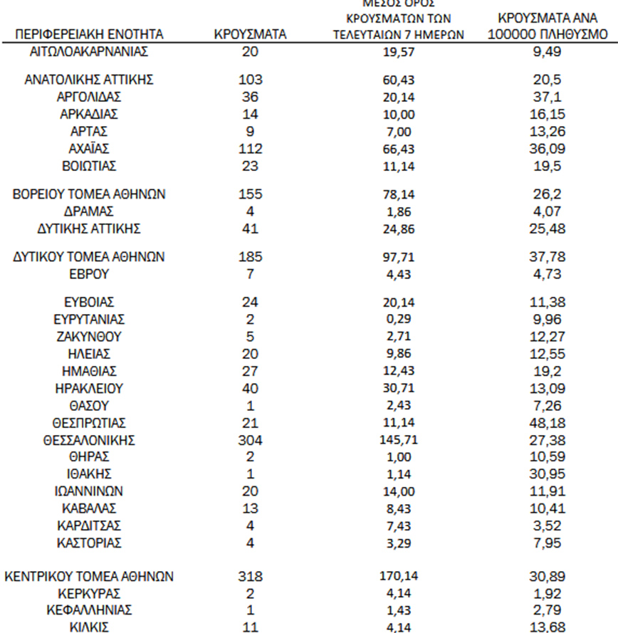 Συγκεκριμένα η Αττική έχει 1.159 κρούσματα, με το κέντρο της Αθήνας να καταγράφει 318 νέες μολύνσεις και τον Πειραιά 202.