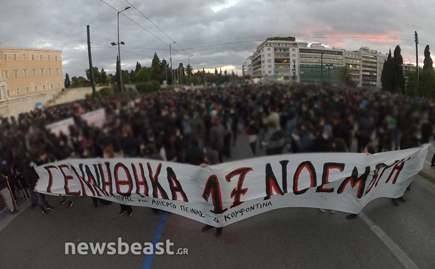 Ολοκληρώθηκε λίγο πριν τις 19:30 το απόγευμα με τη συμμετοχή χιλιάδων διαδηλωτών η πορεία αλληλεγγύης στον Δημήτρη Κουφοντίνα, ο οποίος διανύει την 54η ημέρα απεργίας πείνας.
