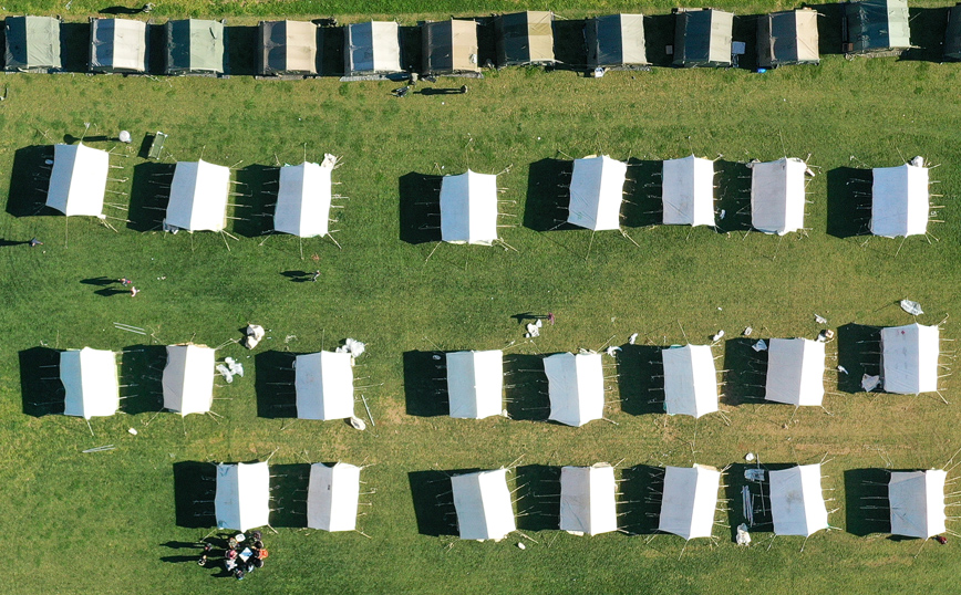 Οι ενάεριες φωτογραφίες αποτυπώνουν την κατάσταση που επικρατεί σήμερα και το μέγεθος της καταστροφής στα κτίρια. Σε γήπεδο της περιοχής στήθηκαν επίσης σκηνές όπου πέρασαν τη νύχτα τους οι κάτοικοι.