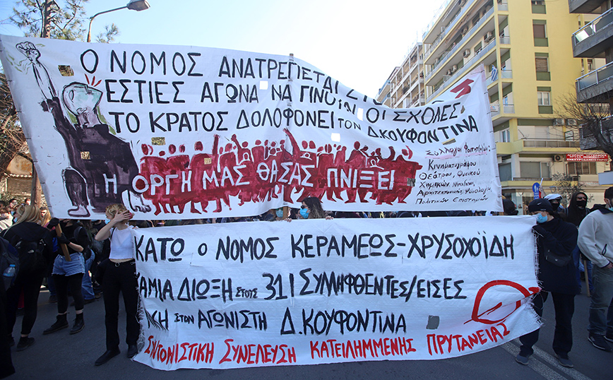 Στην πορεία συμμετείχαν και αντιεξουσιαστές, κρατώντας πανό με σύνθημα συμπαράστασης στον κρατούμενο, καταδικασμένο για συμμετοχή στη «17Ν», απεργό πείνας, Δημήτρη Κουφοντίνα.
