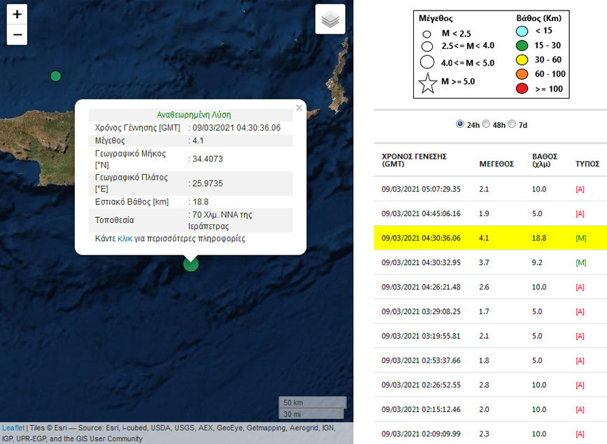 Σεισμός καταγράφηκε στην Κρήτη. Το Γεωδυναμικό Ινστιτούτο υπολόγισε τον σεισμό στα 4,1 Ρίχτερ, 70 χλμ νότια νοτιοανατολικά της Ιεράπετρας, με βάθος 18,8 χλμ.