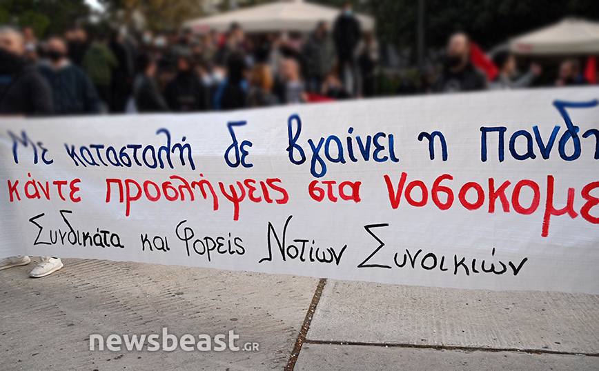 Οι διαδηλωτές κρατούν πανό με συνθήματα όπως «Έξω οι μπάτσοι από τη γειτονιά μας», «Με καταστολή δεν βγαίνει η πανδημία, κάντε προσλήψεις στα νοσοκομεία» αλλά και τη λέξη «Πονάω» την οποία έλεγε ο πολίτης που ξυλοκοπήθηκε από τον αστυνομικό.