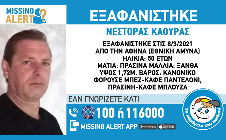 Για την εξαφάνιση του 50χρονου ενεργοποιήθηκε Missing Alert. Σύμφωνα με την ανακοίνωση στις 8.3.2021, εξαφανίστηκε από την περιοχή της Εθνικής Άμυνας στην Αθήνα, ο Κάουρας Νέστορας, 50 ετών. Το «Χαμόγελο του Παιδιού» ενημερώθηκε για την εξαφάνιση του Κάουρα Νέστορα σήμερα και προχώρησε άμεσα στη δημοσιοποίηση των στοιχείων του ενήλικου κατόπιν αιτήματος των συγγενών του, καθώς ενδέχεται να συντρέχουν λόγοι οι οποίοι θέτουν τη ζωή του σε κίνδυνο.