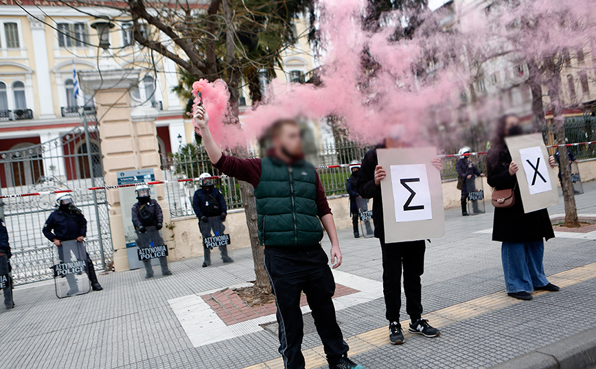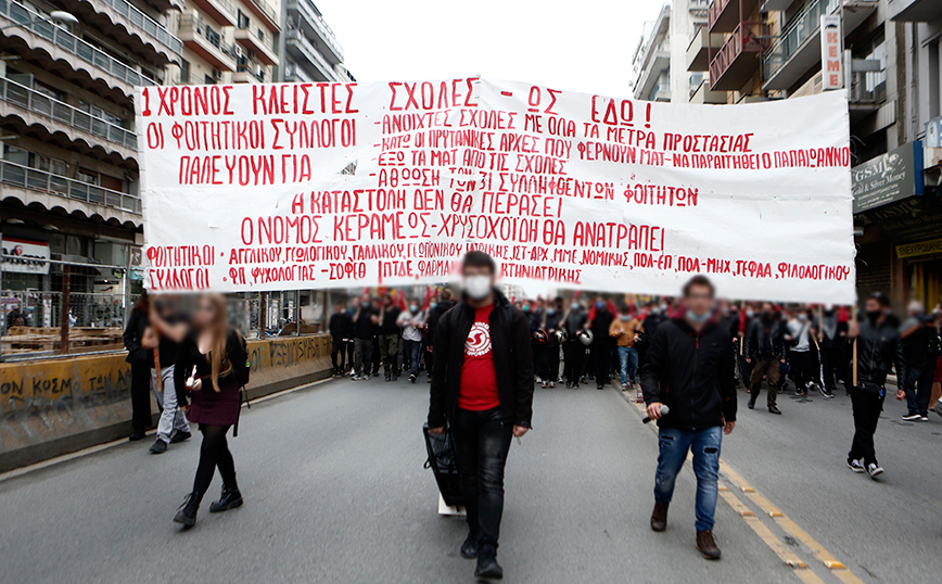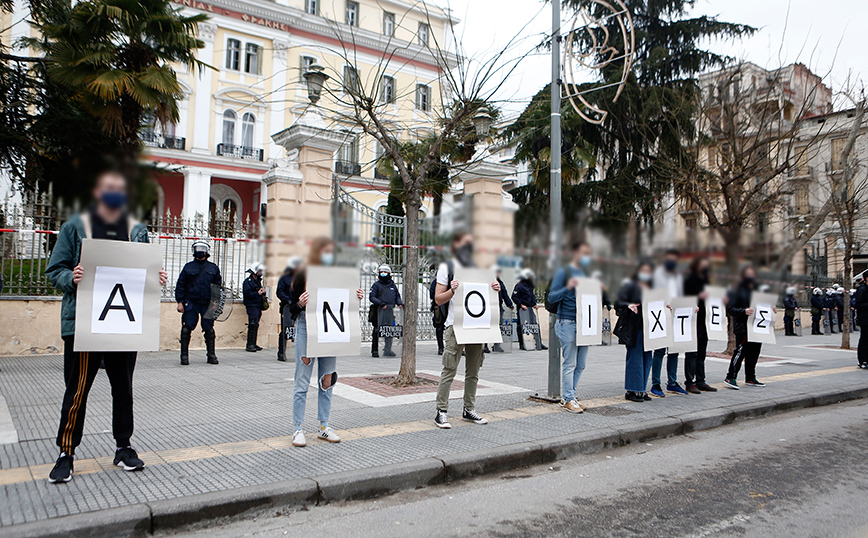 Εκεί, πραγματοποίησαν δρώμενο, σχηματίζοντας με πικέτες τη φράση «Ανοιχτές Σχολές», άναψαν δύο πυρσούς και φώναξαν συνθήματα κατά της «αστυνομικής βίας» και της «κρατικής καταστολής».