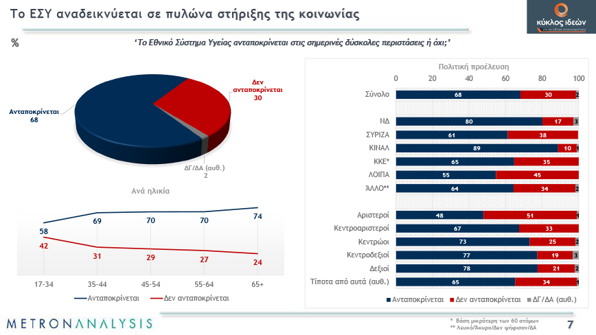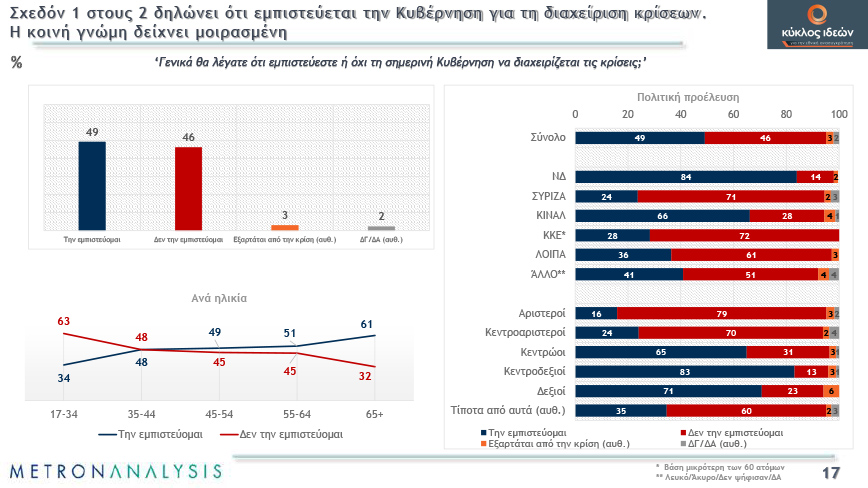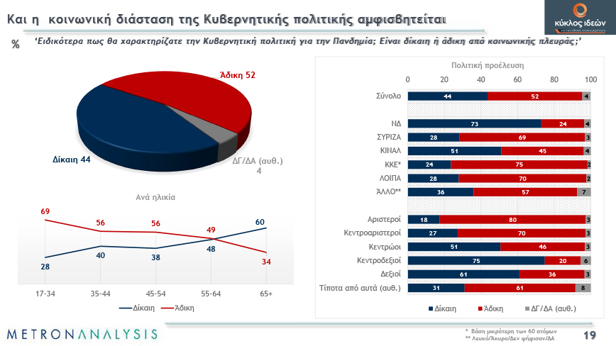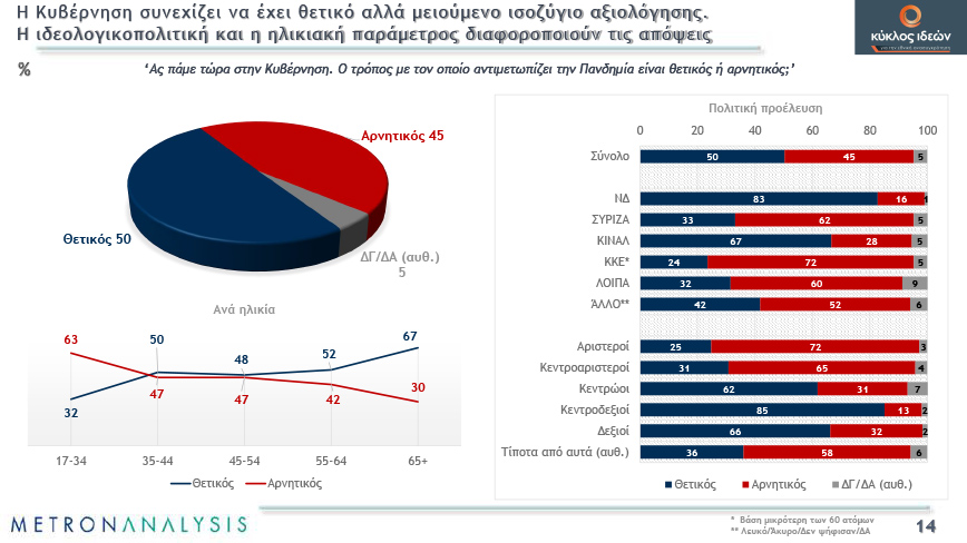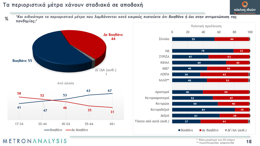 Μοιρασμένη είναι η κοινή γνώμη για το αν εμπιστεύεται την κυβέρνηση στη διαχείριση της κρίσης, ενώ τα περιοριστικά μέτρα χάνουν σταδιακά σε αποδοχή και το δίκαιο ή μη της κυβερνητικής πολιτικής αρχίζει να αμφισβητείται. Χαρακτηριστικό είναι ότι την περασμένη άνοιξη συμφωνούσε με τα περιοριστικά μέτρα το 70%.