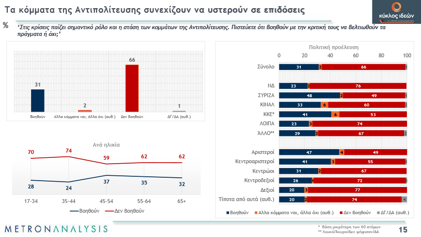 Σύμφωνα με τα συμπεράσματα, προκύπτει ότι η κυβέρνηση συνεχίζει να έχει θετικό αλλά μειούμενο ισοζύγιο αξιολόγησης για την αντιμετώπιση της πανδημίας, ενώ την ίδια στιγμή τα κόμματα της Αντιπολίτευσης υστερούν σε επιδόσεις. Μάλιστα σε σχετική ερώτηση το 66% δηλώνει ότι «η κριτική τους δεν βοηθά να βελτιωθούν τα πράγματα».
