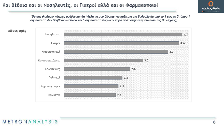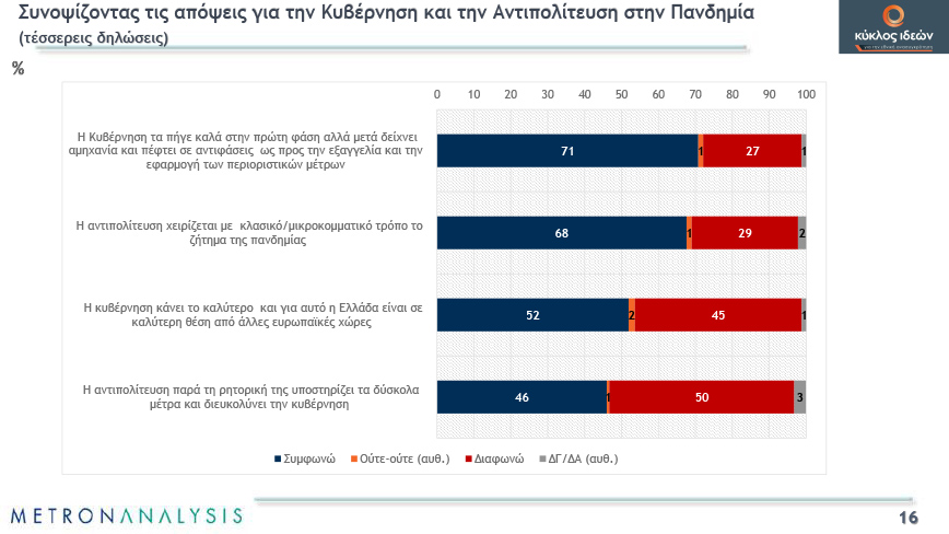 Όπως αναφέρει η πλειοψηφία, σύμφωνα με την έρευνα, «η Κυβέρνηση τα πήγε καλά στην πρώτη φάση αλλά μετά δείχνει αμηχανία και πέφτει σε αντιφάσεις ως προς την εξαγγελία και την εφαρμογή των περιοριστικών μέτρων».
