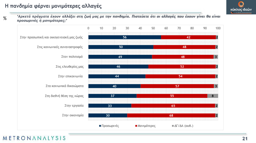 Αναφορικά με τις αλλαγές που θα φέρει η πανδημία, οι περισσότεροι πολίτες προβλέπουν ότι αυτές θα είναι μόνιμες στην προσωπική και οικογενειακή ζωή, τις κοινωνικές συναναστροφές, στον πολιτισμό, τις ελευθερίες και την επικοινωνία μας. Οι περισσότεροι θεωρούν ότι τα επόμενα χρόνια πρέπει να δοθεί προτεραιότητα στην οικονομική ανάπτυξη.