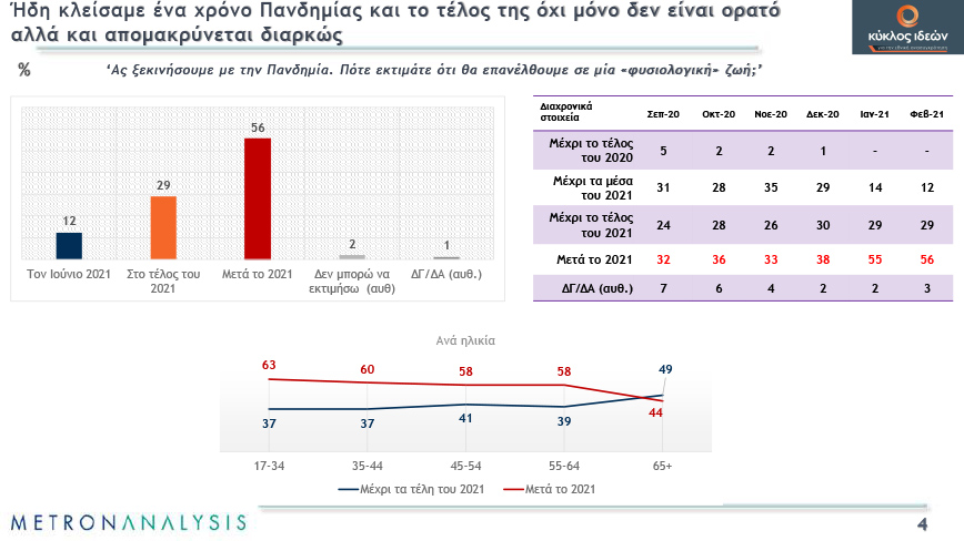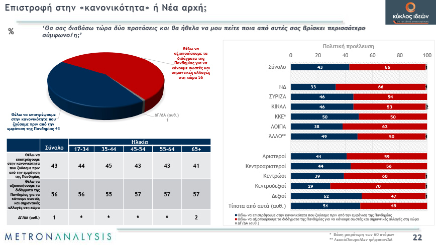 Μείωση στην αποδοχή των περιοριστικών μέτρων κατά του κορονοϊού και απαγοήτευση για το τέλος της πανδημίας στην πλειοψηφία των πολιτών, αλλά και μοιρασμένες απόψεις για το αν η κυβερνητική πολιτική σέβεται τους δημοκρατικούς κανόνες, δείχνει, μεταξύ άλλων μεγάλη πανελλαδική έρευνα που πραγματοποίησε η Metron Analysis.