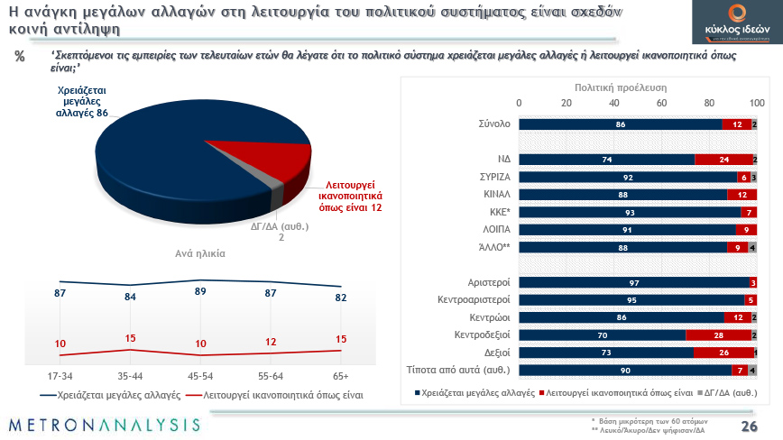 Όσον αφορά στην πανδημία και τη δημοκρατία, μοιρασμένες είναι οι γνώμες για το σεβασμό των δημοκρατικών κανόνων από την Κυβερνητική πολιτική, ενώ η ανάγκη μεγάλων αλλαγών στη λειτουργία του πολιτικού συστήματος είναι σχεδόν κοινή αντίληψη.