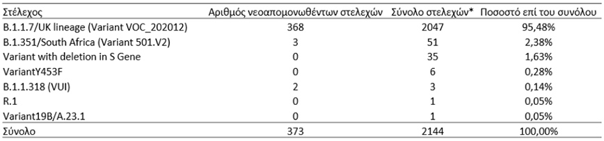 Από τα 371 δείγματα με στελέχη VOC, τα 368 βρέθηκαν με τη μετάλλαξη Β.1.1.7/UK lineage (βρετανική) και 3 δείγματα με τη μετάλλαξη Lineage B.1.351/South Africa (νοτιοαφρικανική).