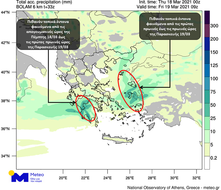 Σύμφωνα με τα διαθέσιμα προγνωστικά στοιχεία του Εθνικού Αστεροσκοπείου Αθηνών / Meteo.gr, από το μεσημέρι της Πέμπτης 18/03 αναμένονται βροχές και τοπικές καταιγίδες στη Δυτική Στερεά Ελλάδα, στα νησιά του Ιονίου και στην Πελοπόννησο. Βαθμιαία τα φαινόμενα θα επεκταθούν ανατολικά και θα επηρεάσουν τα κεντρικά τμήματα, ενώ από τις βραδινές ώρες της Πέμπτης 18/03 έως τις πρωινές ώρες της Παρασκευής 19/03 βροχές και τοπικές καταιγίδες θα εκδηλωθούν στα νησιά του Ανατολικού και Βορείου Αιγαίου, στις Κυκλάδες, στην Ανατολική Μακεδονία και στη Θράκη, ενώ στις υπόλοιπες περιοχές θα εξασθενήσουν. Χιονοπτώσεις αναμένονται στα κεντρικά και βόρεια ορεινά ηπειρωτικά, καθώς και πρόσκαιρα σε ημιορεινές περιοχές της Ηπείρου και της Δυτικής Μακεδονίας.
