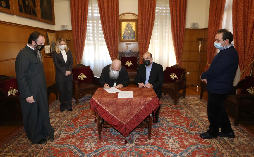 Αρχιεπισκοπή από τον Μακαριώτατο Αρχιεπίσκοπο Αθηνών και πάσης Ελλάδος κ.κ. Ιερώνυμο και τον κ. Ιωάννη Μασούτη, Διευθύνοντα Σύμβουλο της «Διαμαντής Μασούτης Α.Ε.», παρουσία του Γενικού Διευθυντή της Αποστολής κ.