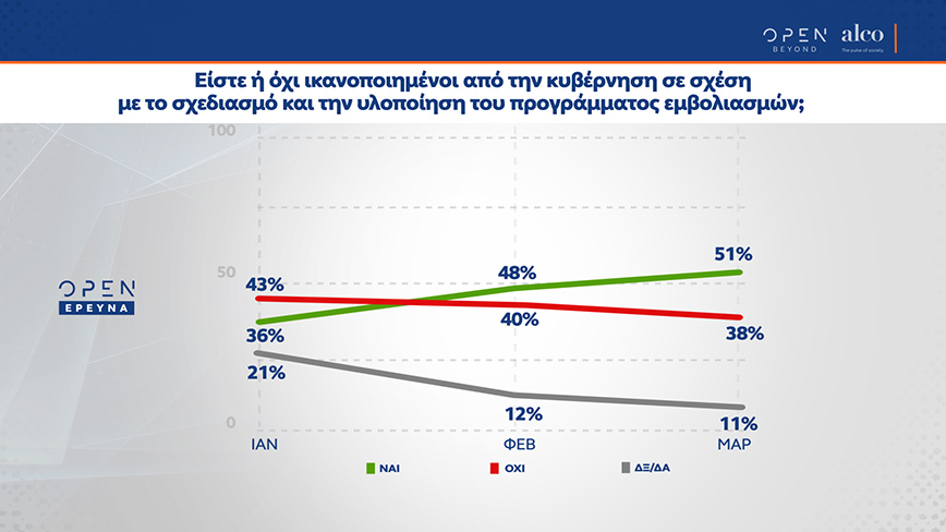 Tο 51% δηλώνει ικανοποιημένο από την κυβέρνηση σε σχέση με τον σχεδιασμό και την υλοποίηση για το πρόγραμμα εμβολιασμών.