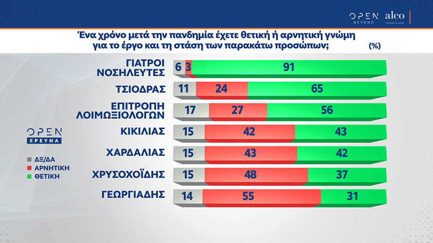 Σε ερώτηση για το αν ένα χρόνο μετά την πανδημία έχετε θετική ή αρνητική γνώμη για το έργο και τη στάση προσώπων, το 91% κρίνει θετικά τους γιατρούς, το 65% έχει θετική άποψη για τον Σωτήρη Τσιόδρα έναντι του 24% που έχει αρνητική. Αρνητική είναι η άποψη για τον Νίκο Χαρδαλιά σε ποσοστό 43%, σε 48% για τον Μιχάλη Χρυσοχοΐδη και στο 55% για τον Άδωνη Γεωργιάδη.