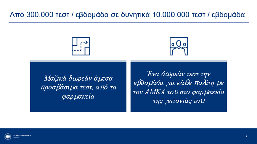 Αυτό θα επιτευχθεί με μαζικά δωρεάν και άμεσα προσβάσιμα τεστ από τα φαρμακεία, ενώ κάθε πολίτης θα μπορεί να κάνει κάθε εβδομάδα (δηλαδή 4 φορές τον μήνα) από ένα rapid test.