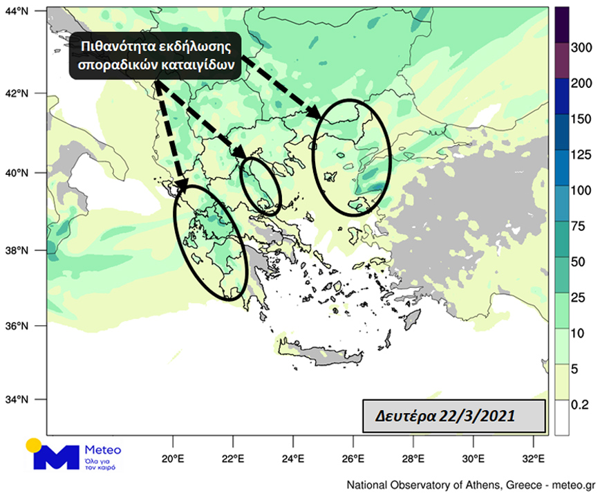 Πιθανότητα σποραδικών καταιγίδων υπάρχει κατά κύριο λόγο στο Ιόνιο, στα κεντρικά και νότια ηπειρωτικά (πλην Ανατολικής Στερεάς και Ανατολικής Πελοποννήσου), στη Θράκη και στο Ανατολικό Αιγαίο.