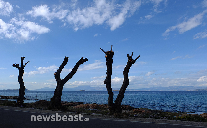 Βέβαια, τα περισσότερα από αυτά τα δέντρα (ευκάλυπτοι και αρμυρίκια) τώρα την άνοιξη θα «ξαναπετάξουν», αλλά για την ώρα μάλλον συνθέτουν ένα σκηνικό που φέρνει λίγο σε γκραν-γκινιόλ.