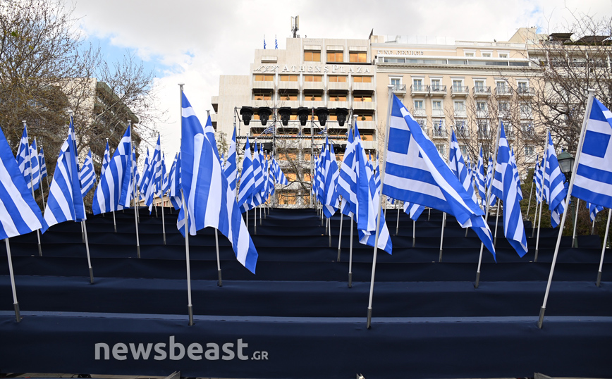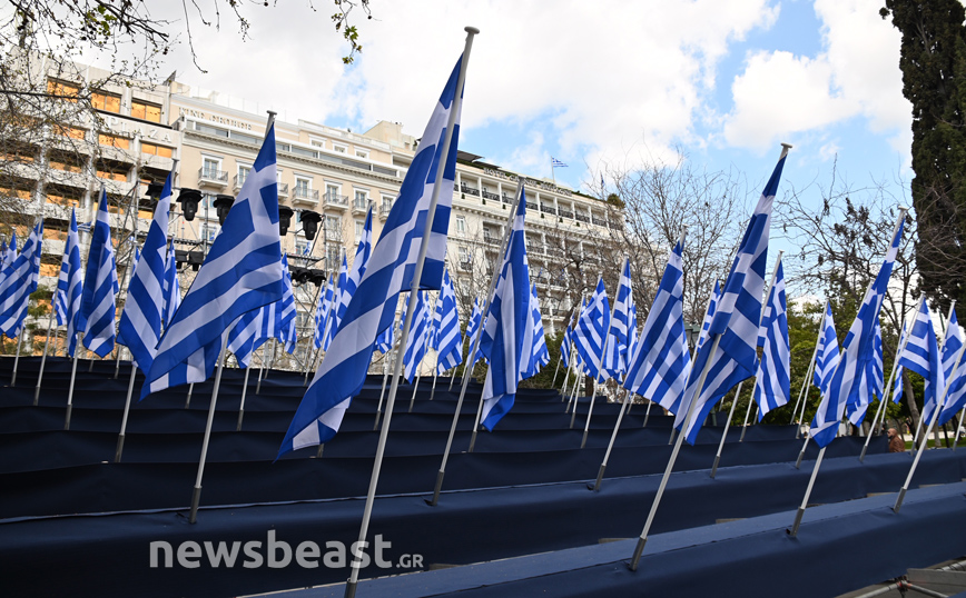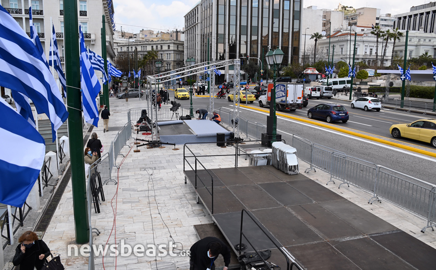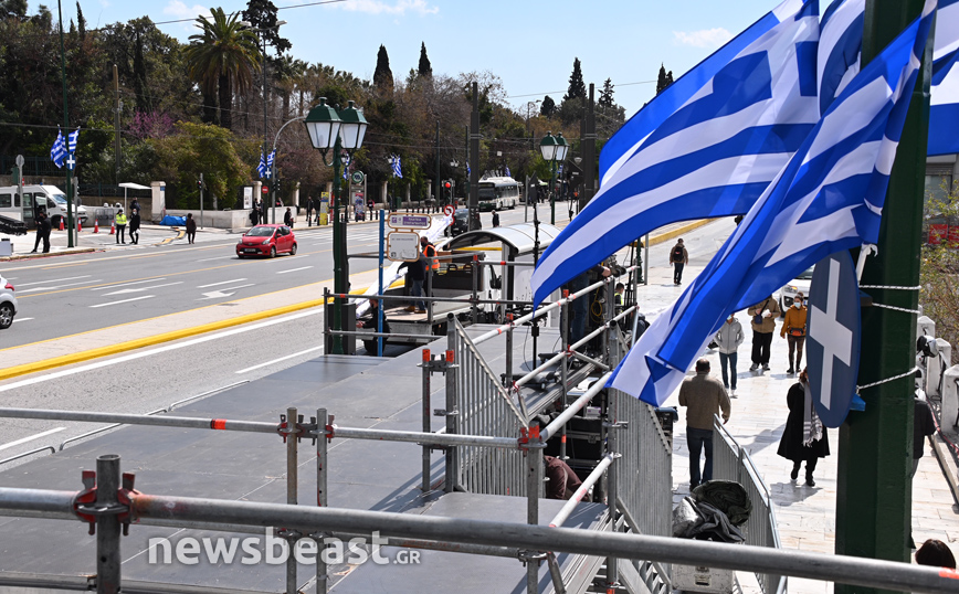 Συνεχίζονται οι προετοιμασίες στο κέντρο της Αθήνας και γύρω από την πλατεία Συντάγματος ενόψει της παρέλασης και των εορτασμών για την 25η Μαρτίου και τον εορτασμό για τα 200 χρόνια από την Επανάσταση του 1821.