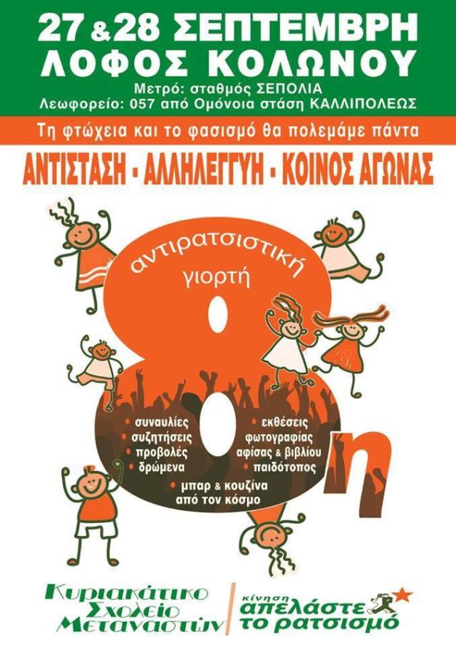 Συναυλίες, συζητήσεις, προβολές, θεατρικά δρώμενα, εκθέσεις αντιφασιστικού σκίτσου και αφίσας, παιδότοπο και διεθνή κουζίνα περιλαμβάνει το πρόγραμμα της 8ης Αντιρατσιστικής Γιορτής του Κυριακάτικου Σχολείου Μεταναστών και της Κίνησης «Απελάστε το Ρατσισμό», η οποία πραγματοποιείται το Σαββατοκύριακο 27 και 28 Σεπτέμβρη, στο λόφο Κολωνού.