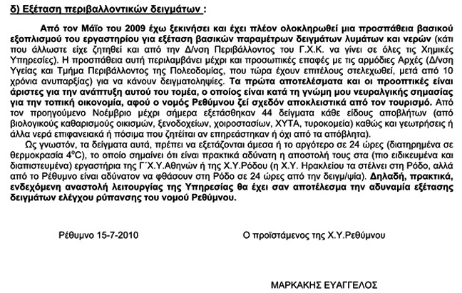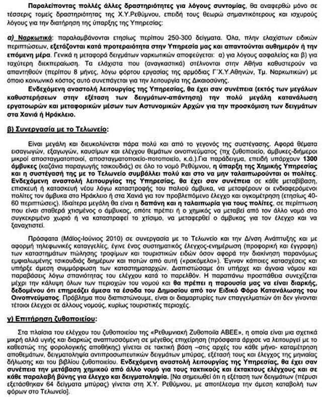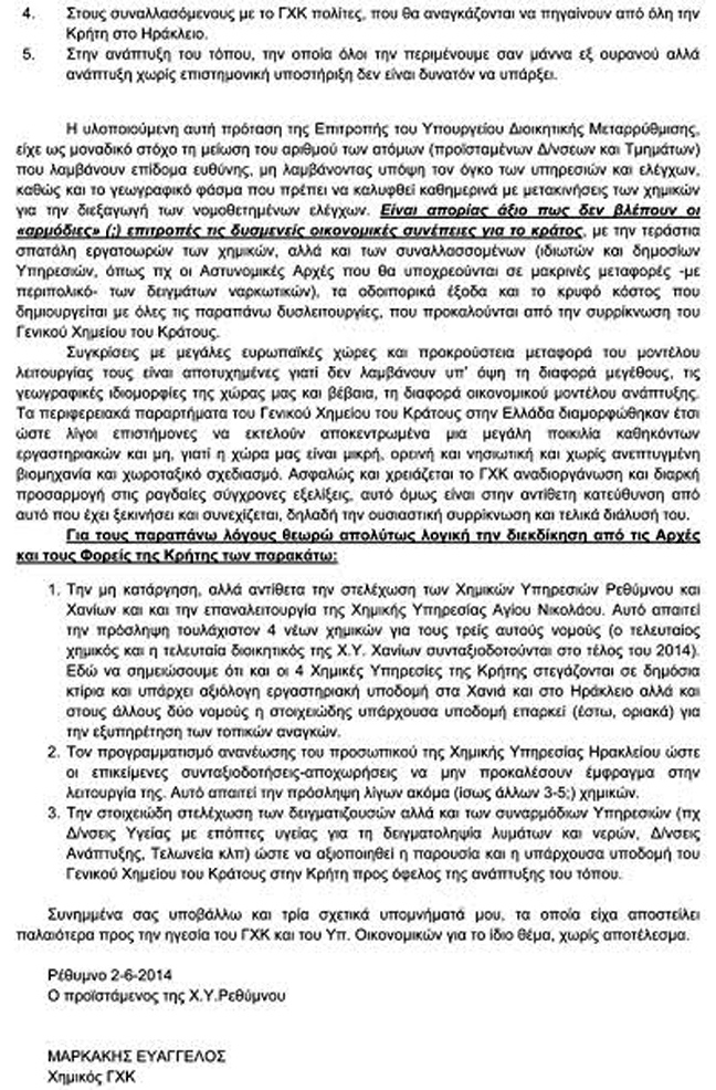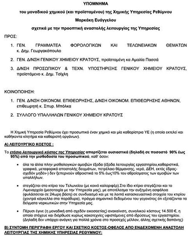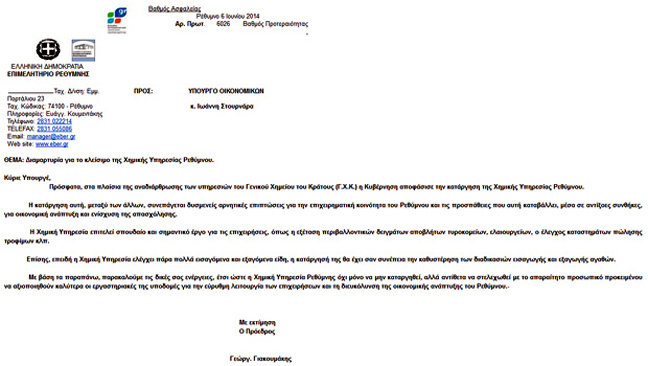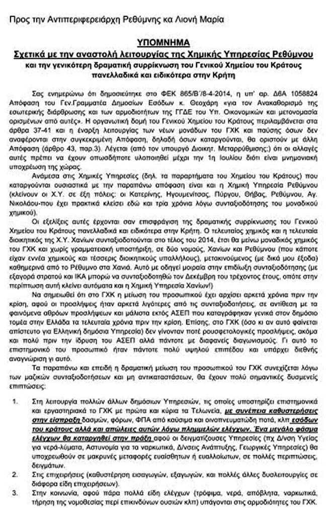 Σε έγγραφό του προς την Αντιπεριφερειάρχη Ρεθύμνης στις αρχές του καλοκαιριού (παρατίθεται στη συνέχεια), Μαρία Λιονή, αναφέρει: «Ανάμεσα στις Χημικές Υπηρεσίες, που καταργούνται, είναι και η Χημική Υπηρεσία Ρεθύμνου. Οι εξελίξεις αυτές έρχονται σαν επισφράγιση της δραματικής συρρίκνωσης του Γενικού Χημείου του Κράτους πανελλαδικά και ειδικότερα στην Κρήτη. Ο τελευταίος χημικός και η τελευταία διοικητικός της Χ.Υ. Χανίων συνταξιοδοτούνται στο τέλος του 2014, έτσι θα μείνω μοναδικός χημικός του ΓΧΚ και χωρίς γραμματειακή υποστήριξη, σε δύο νομούς, Χανίων και Ρεθύμνου (που κάποτε είχαν εννέα χημικούς και τέσσερις διοικητικούς υπαλλήλους), μετακινούμενος (με δικά μου έξοδα) καθημερινά από το Ρέθυμνο στα Χανιά. Αυτό με οδηγεί μοιραία στην επιδίωξη συνταξιοδότησης».